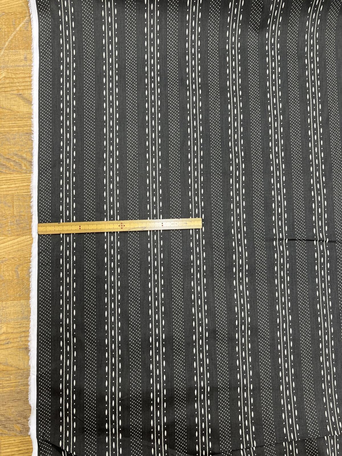 やや杢感のあるブラック地に、ベージュで表現されたストライプと点線を組み合わせたプリント柄です。