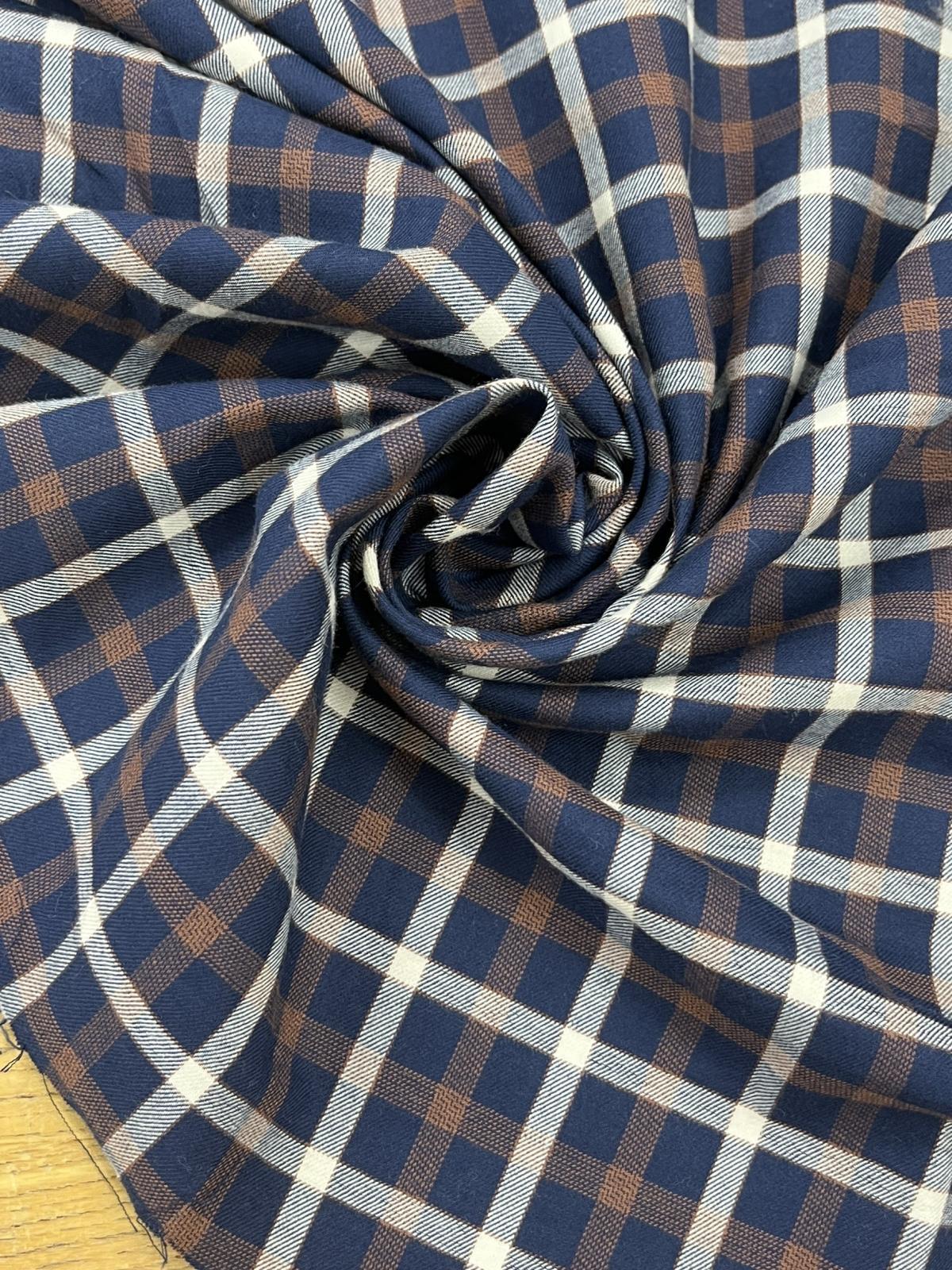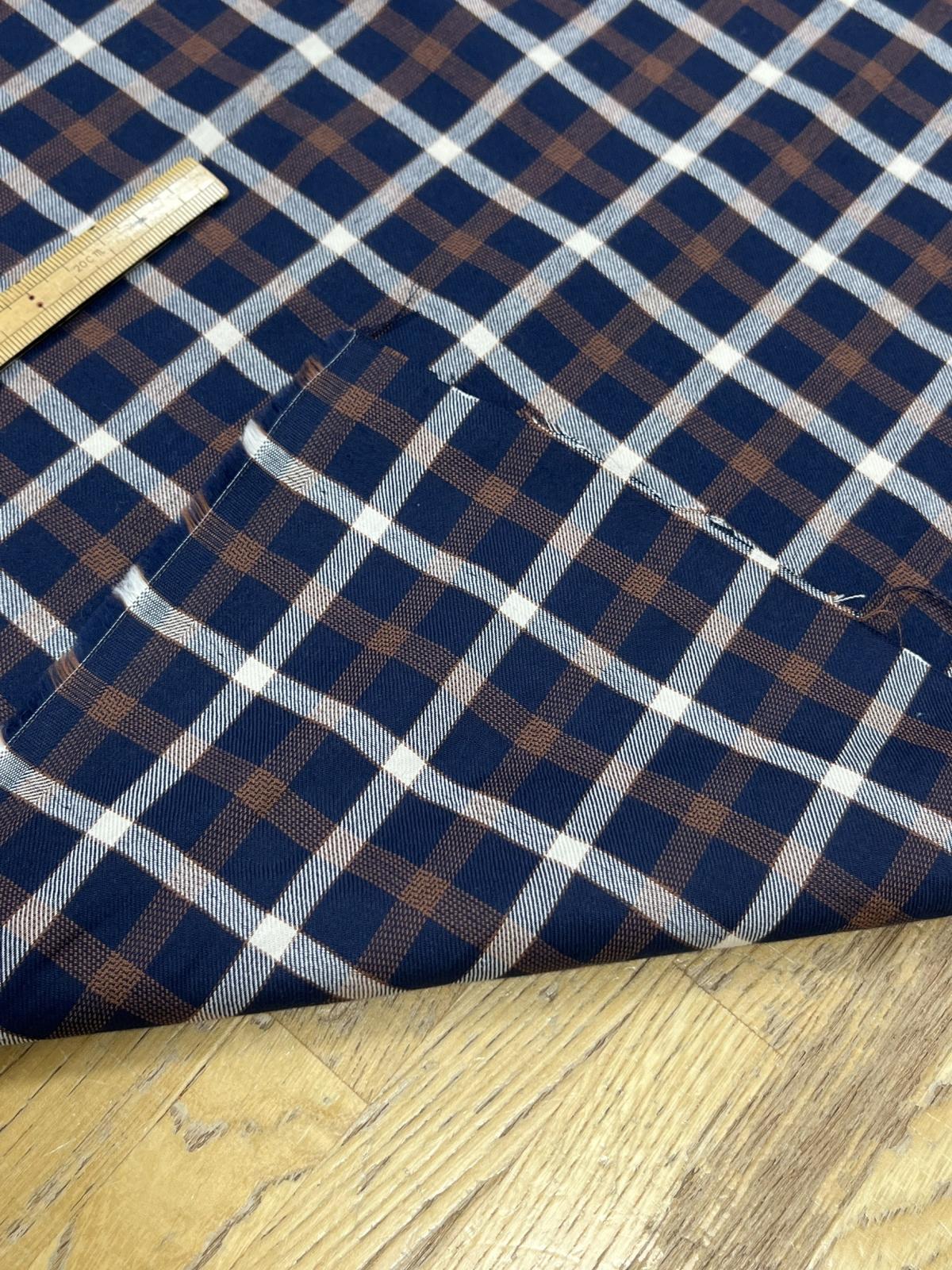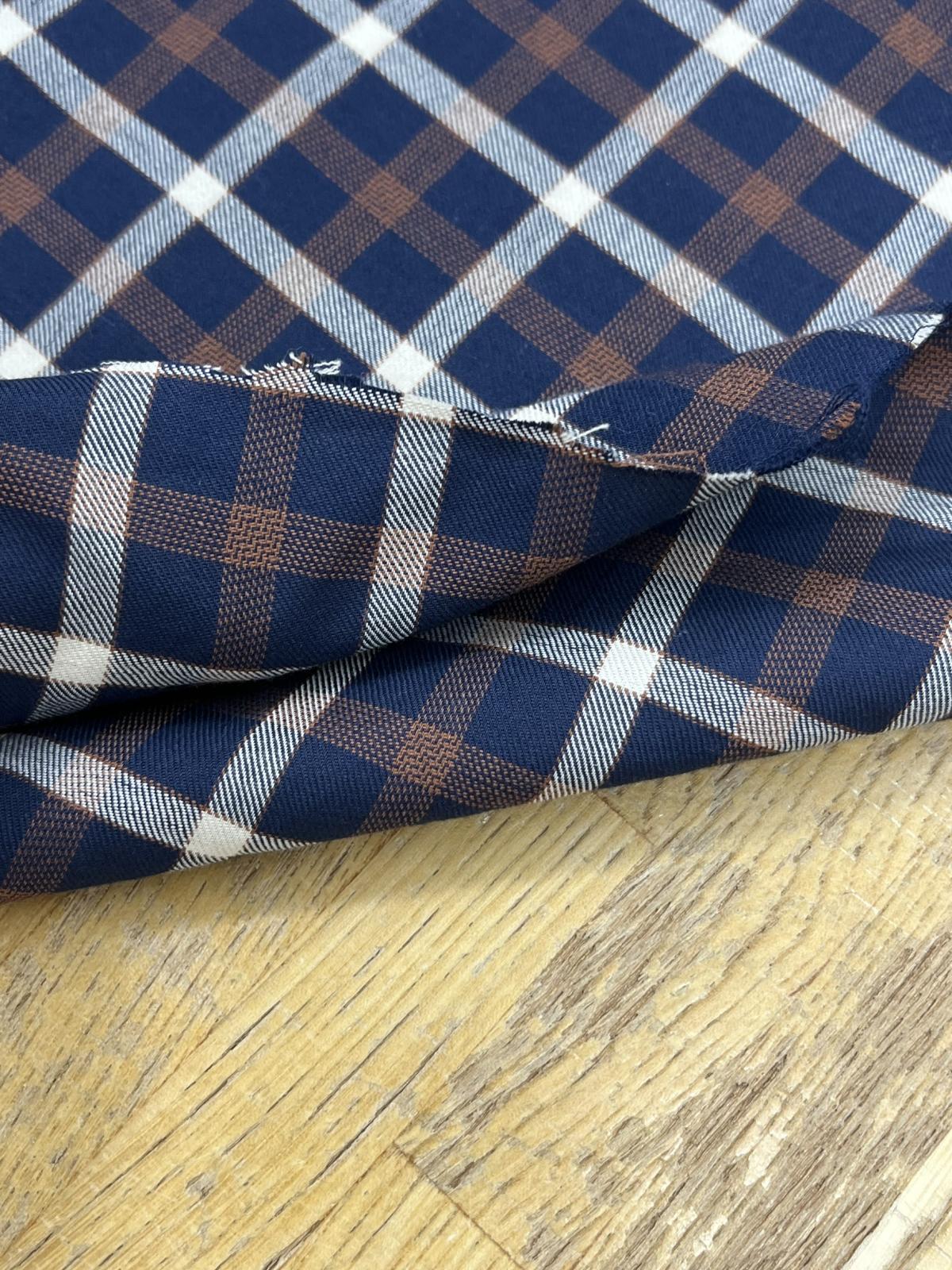 紺をベースに、茶と白を組み合わせた落ち着きのあるチェック柄。