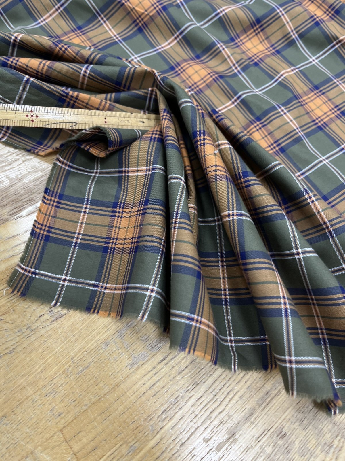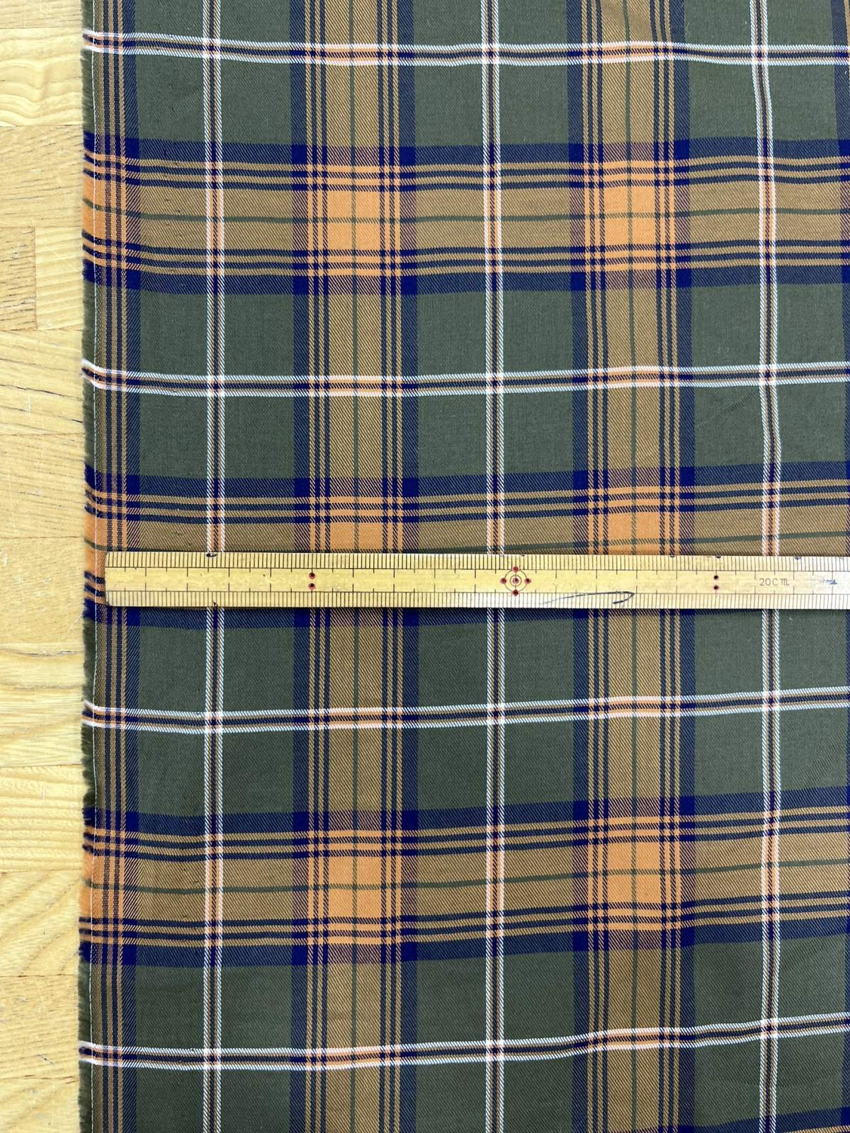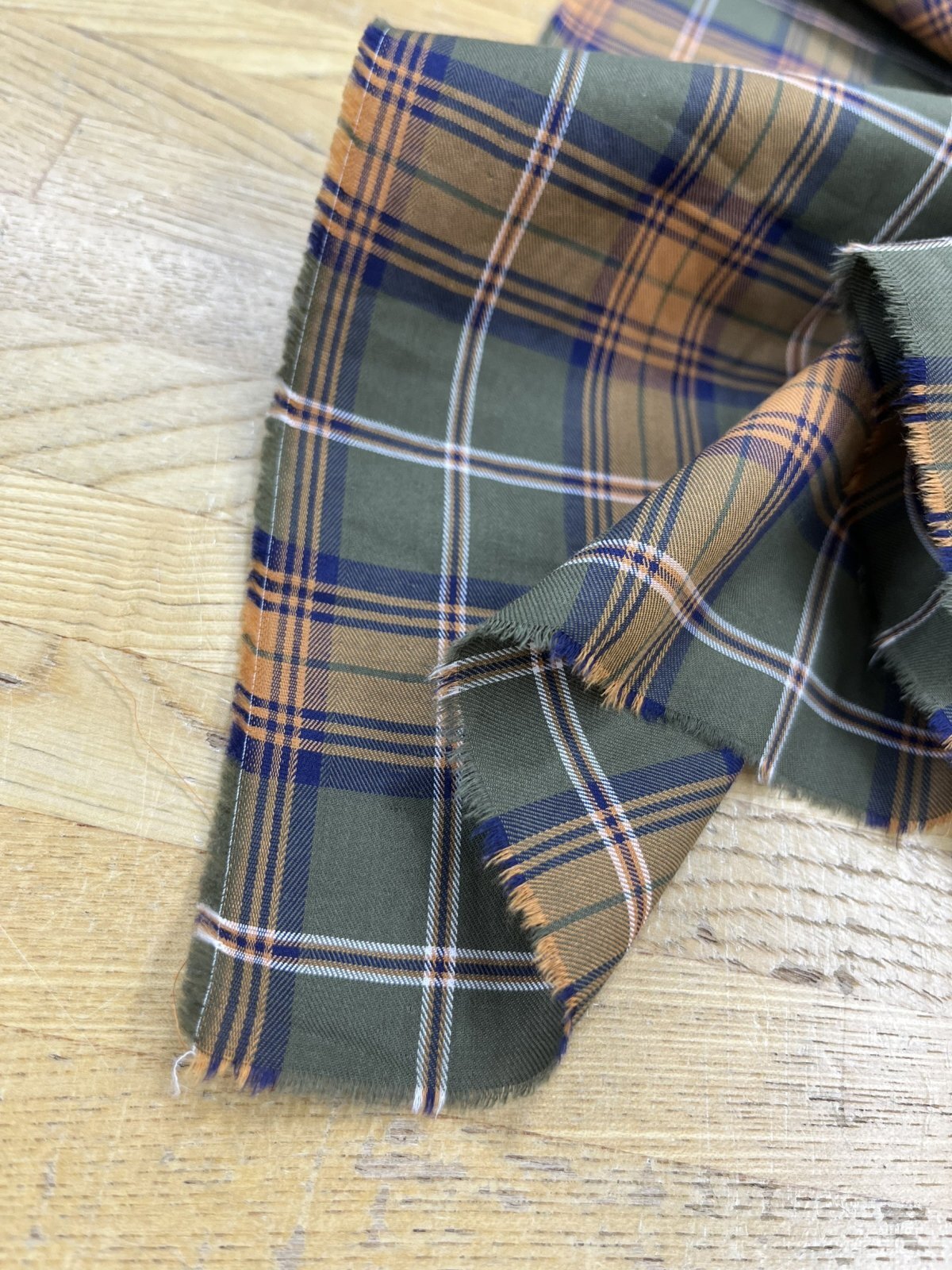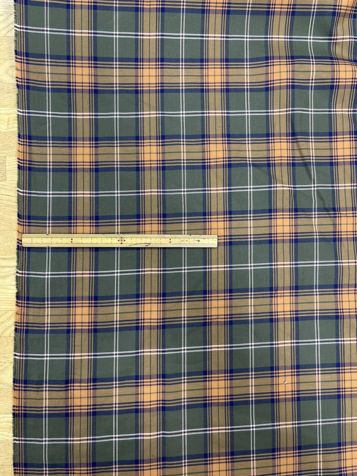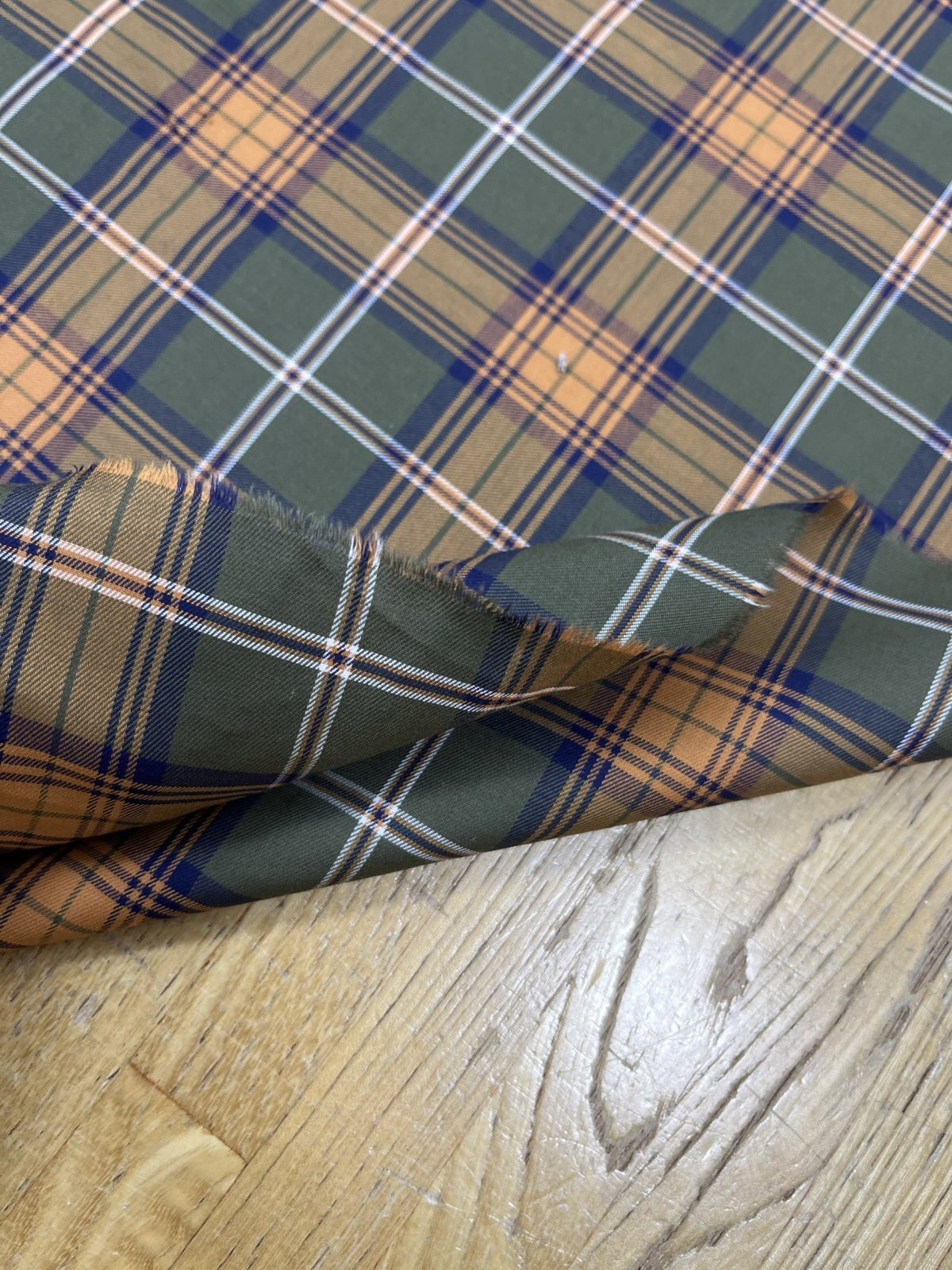 カーキ地にオレンジを効かせたチェック柄が印象的な、綿100%の織り生地です。