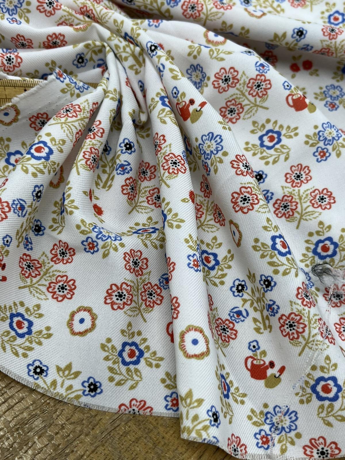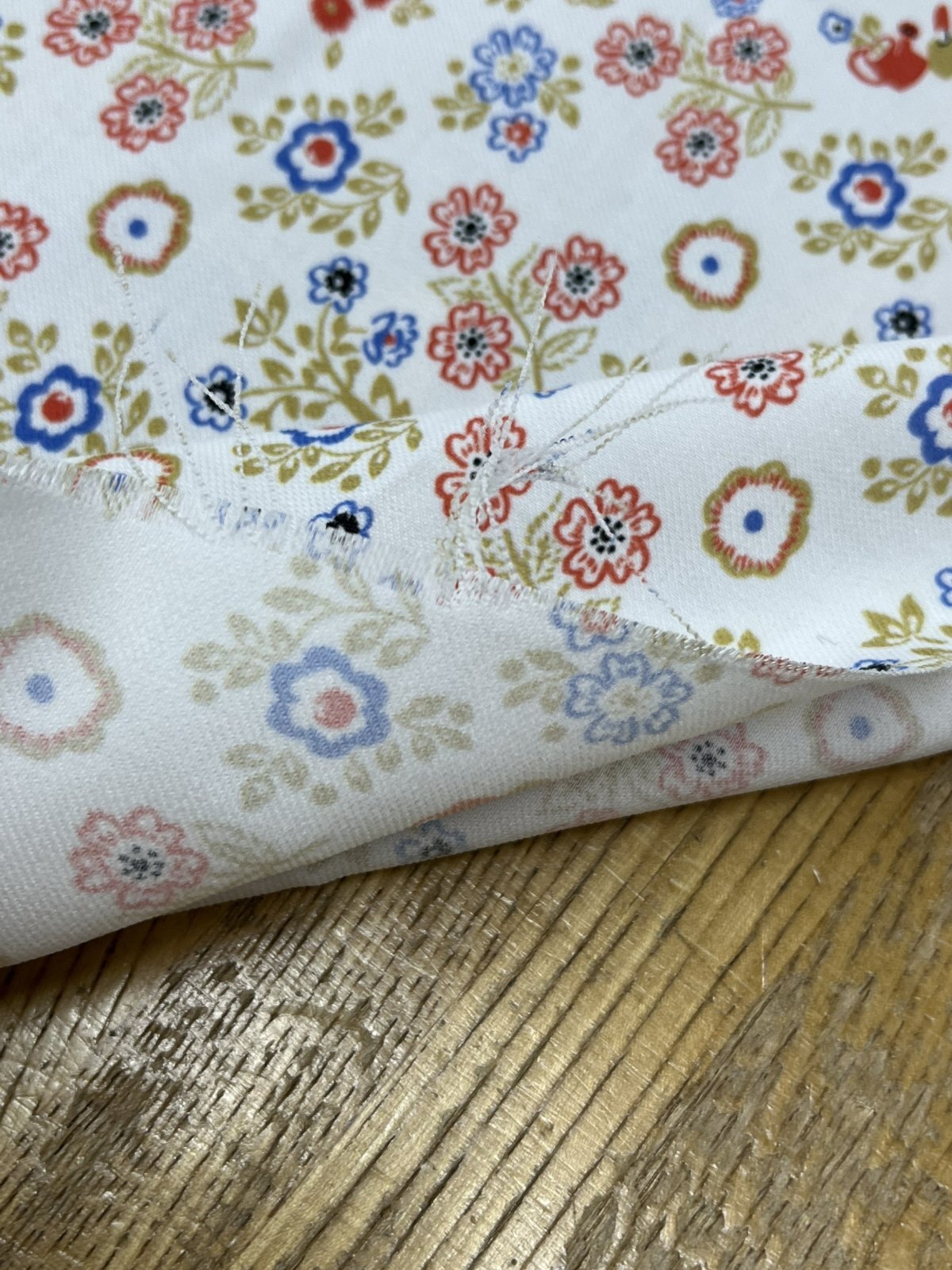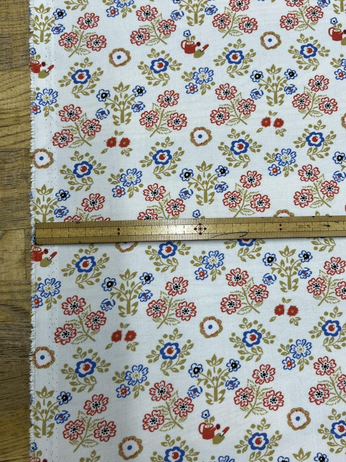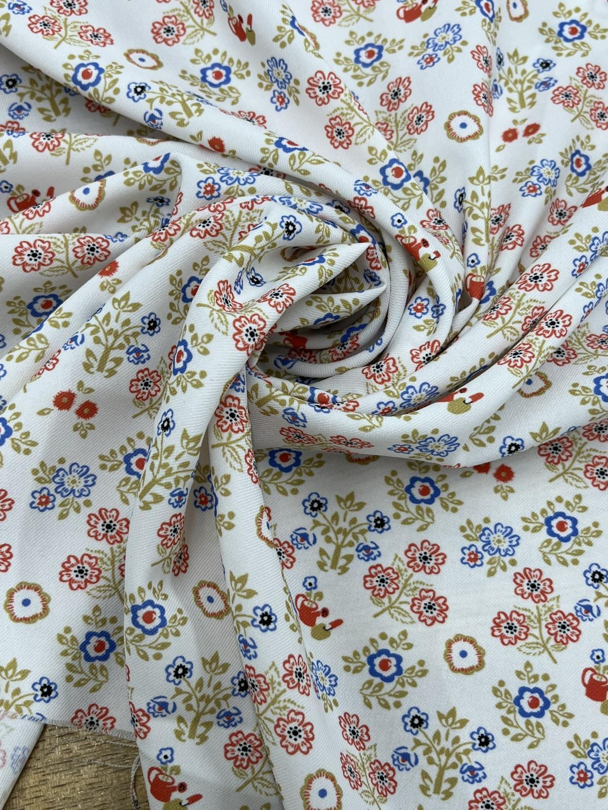 オフホワイトのベースに、赤・青・グリーン・ベージュブラウンを基調としたクラシカルな小花柄プリント。