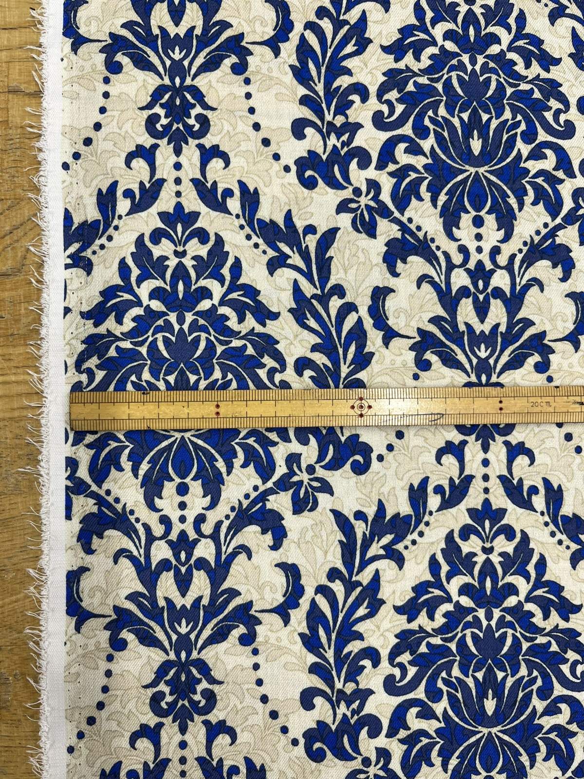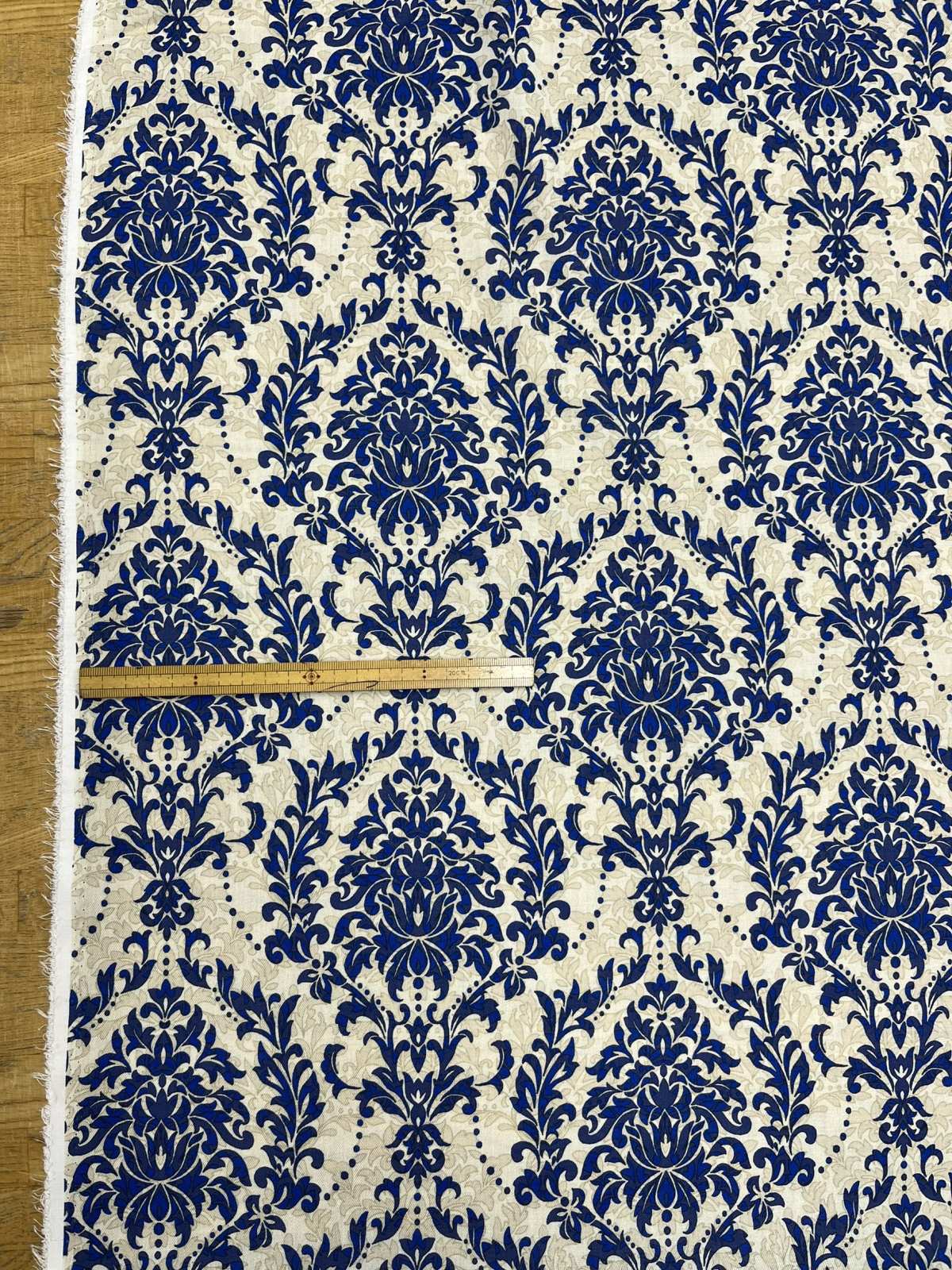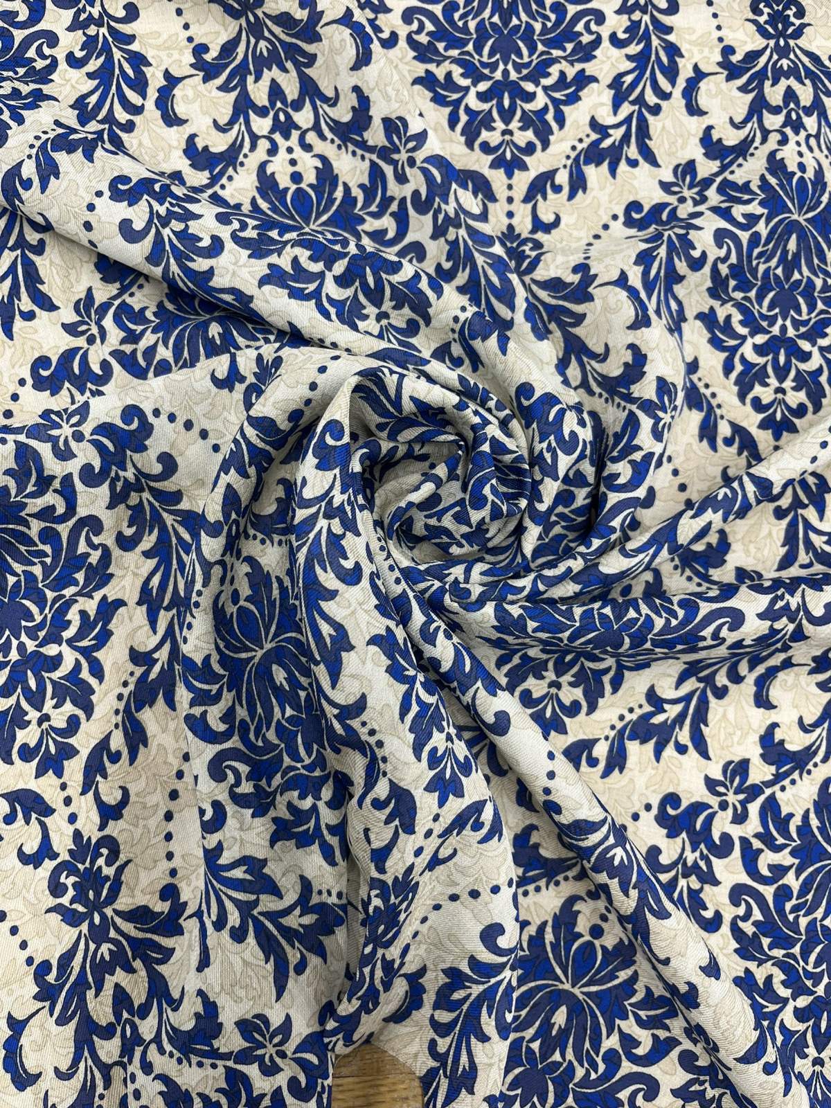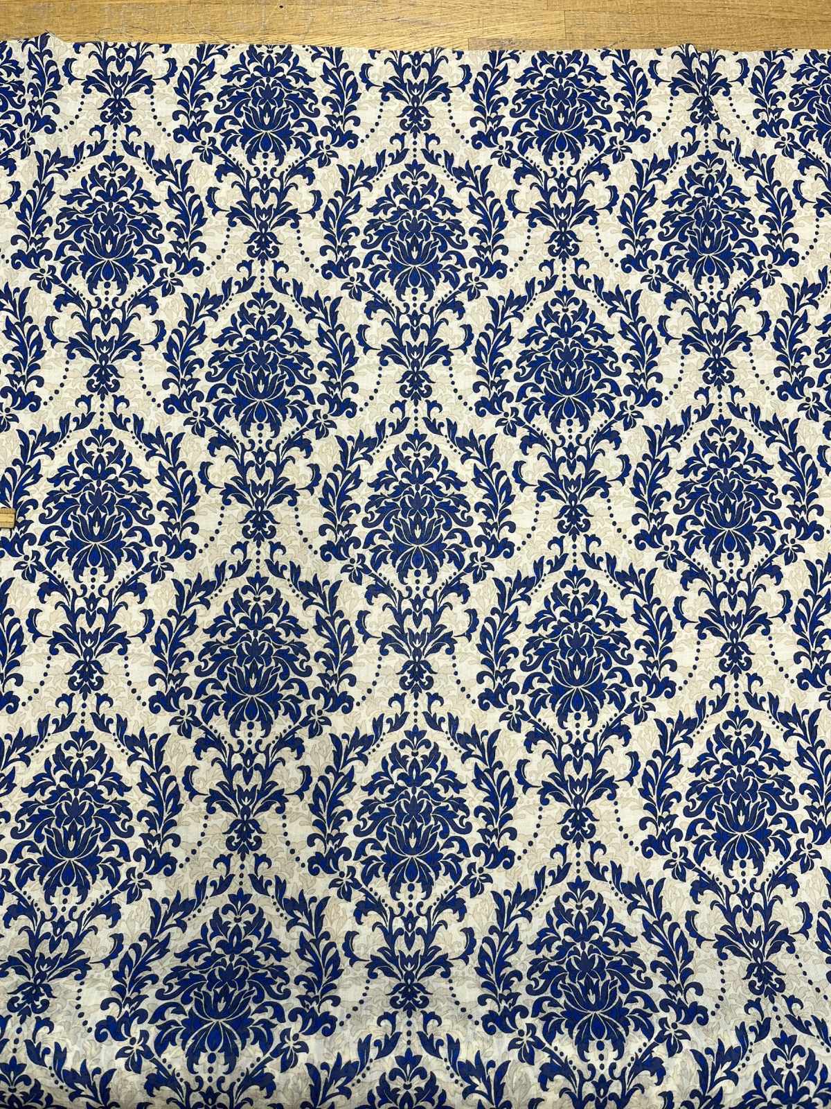 生地:ポリエステル100% ダマスク柄プリント(ベージュ×ブルー)