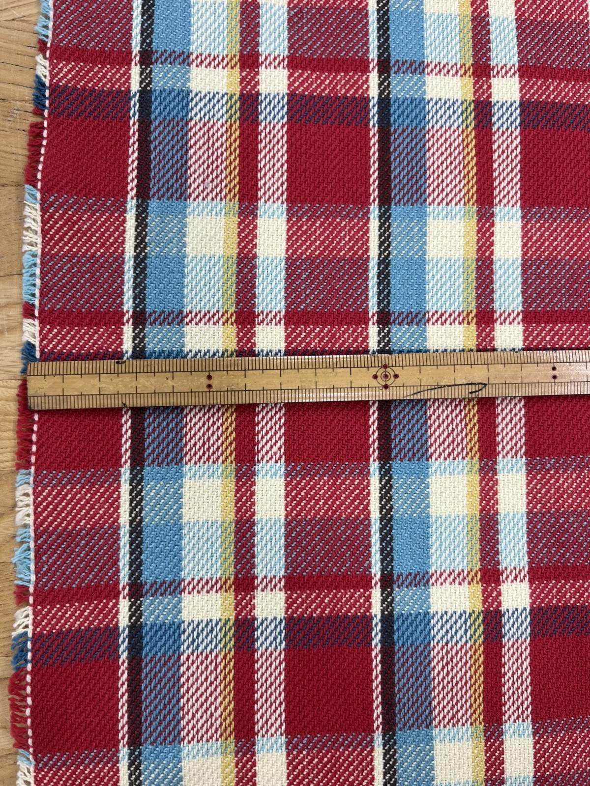赤をベースに、ブルー・生成り・ブラックを効かせたチェック柄で、クラシックさとカジュアル感を併せ持つ配色。