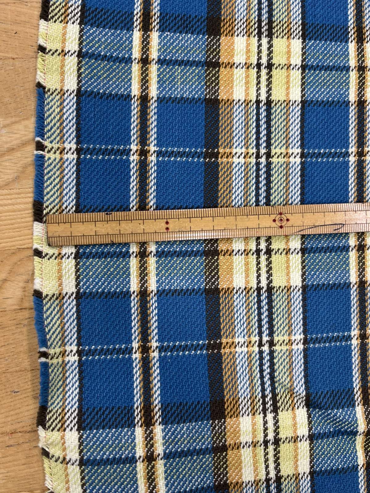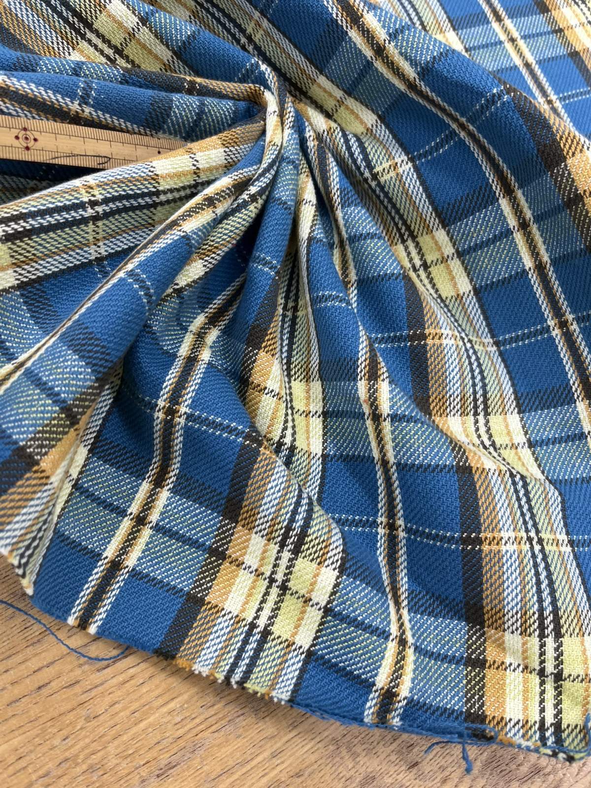 深みのあるブルーを基調に、生成り・イエロー・ブラック系を効かせたチェック柄で、