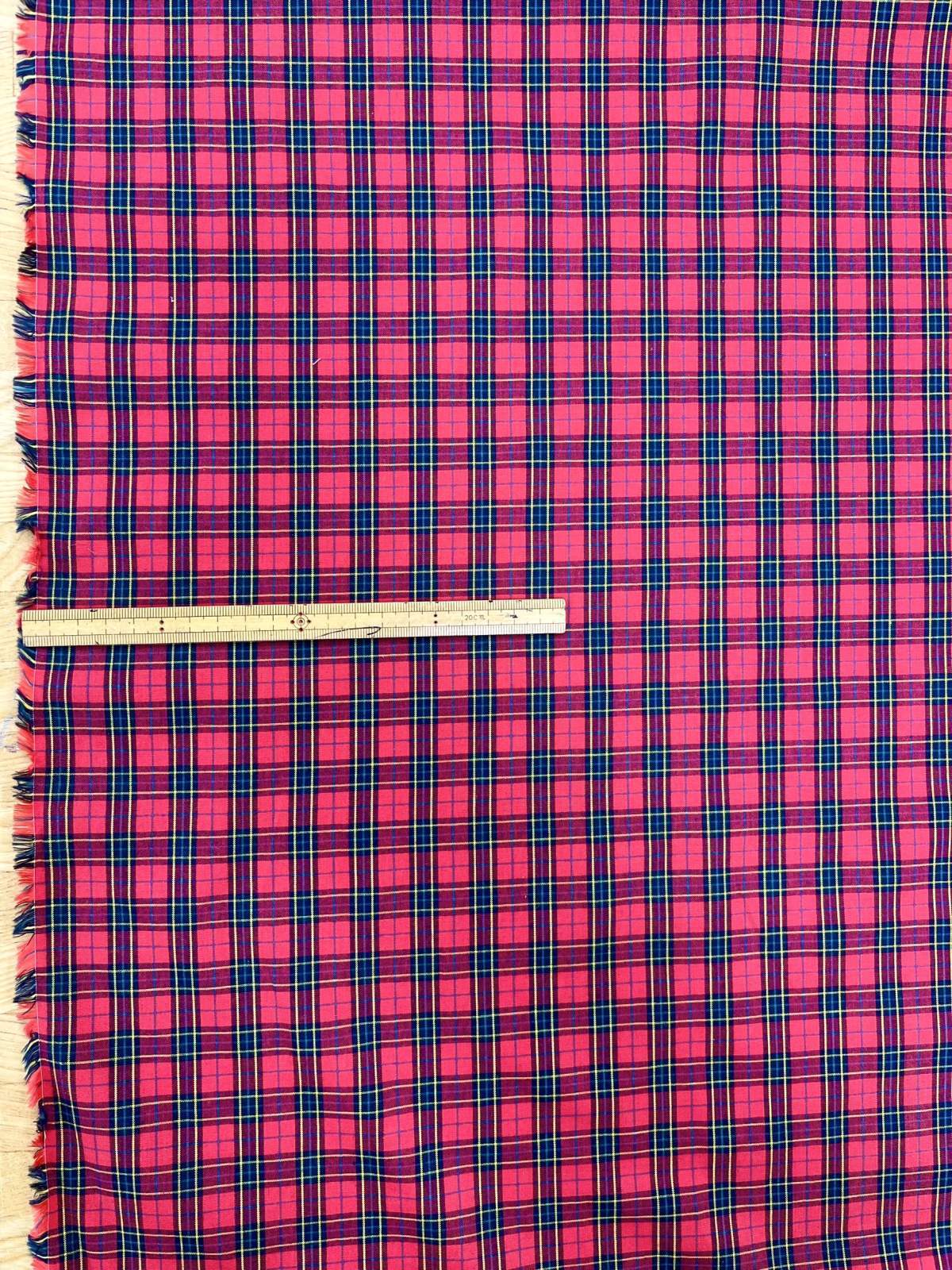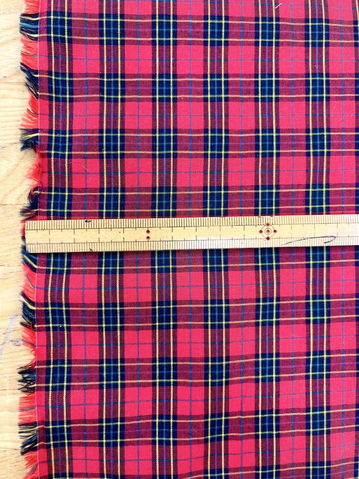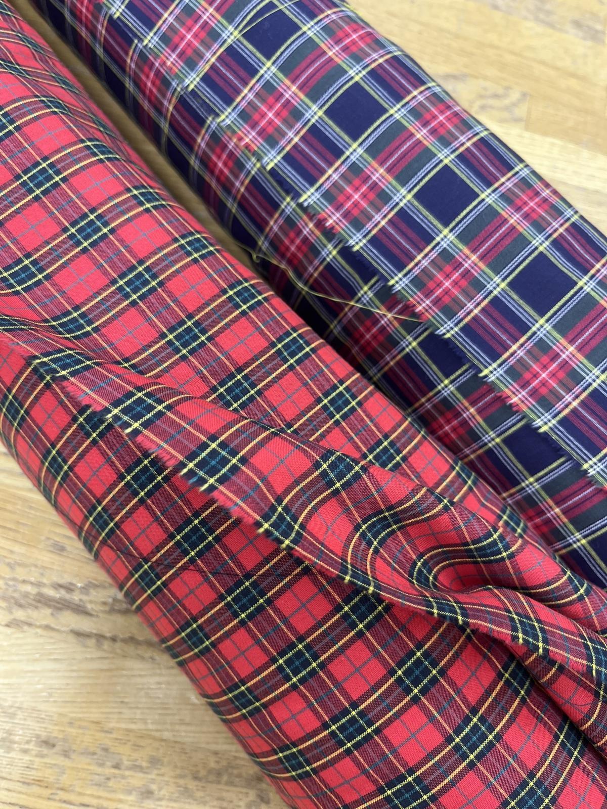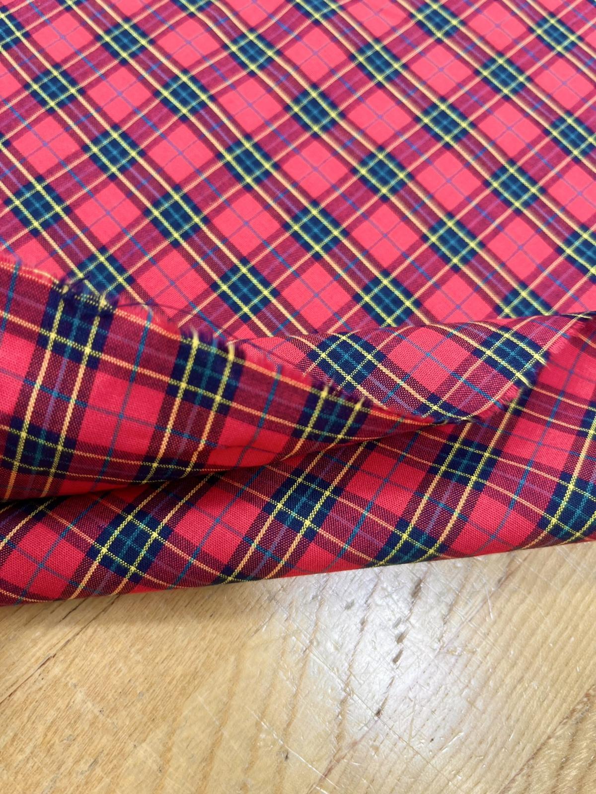 鮮やかな赤をベースに、ネイビー・グリーン・イエローのラインを重ねた、クラシックなタータンチェック柄の綿100%生地です。