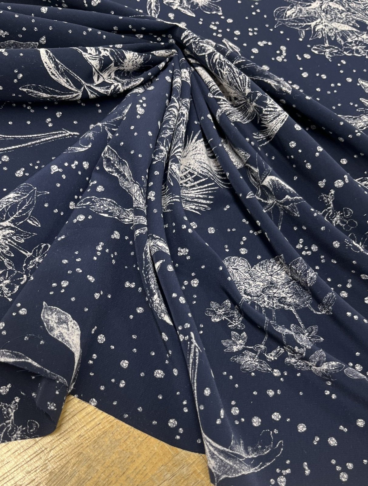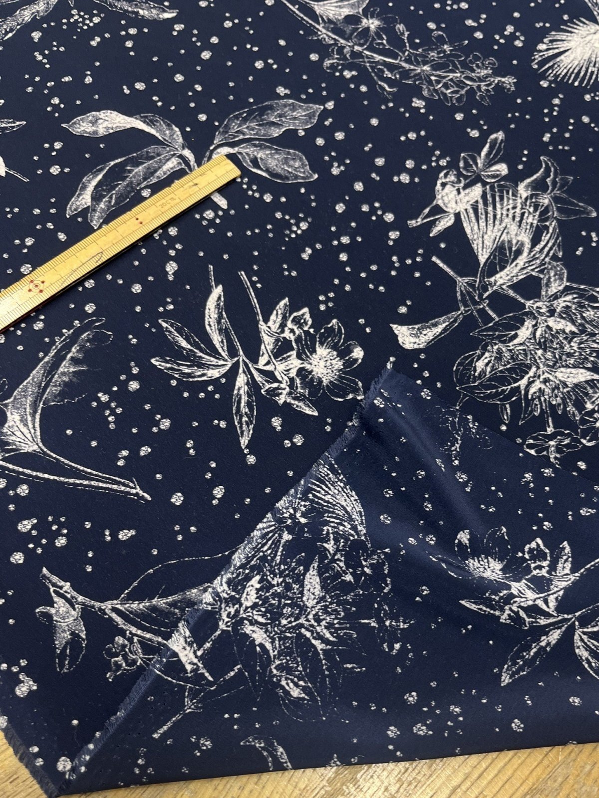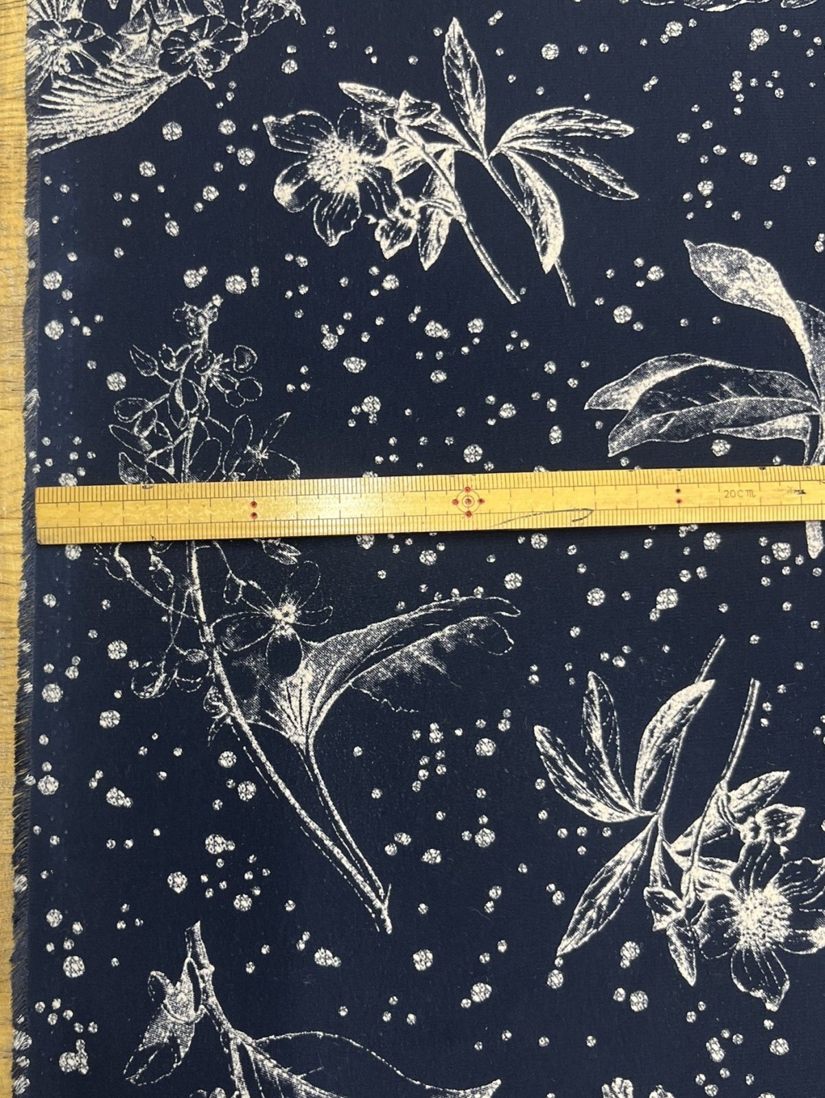 濃紺の地に、繊細な線画タッチの花柄と細かなドット柄が重なり、落ち着きの中に華やかさのある印象に仕上がっています。