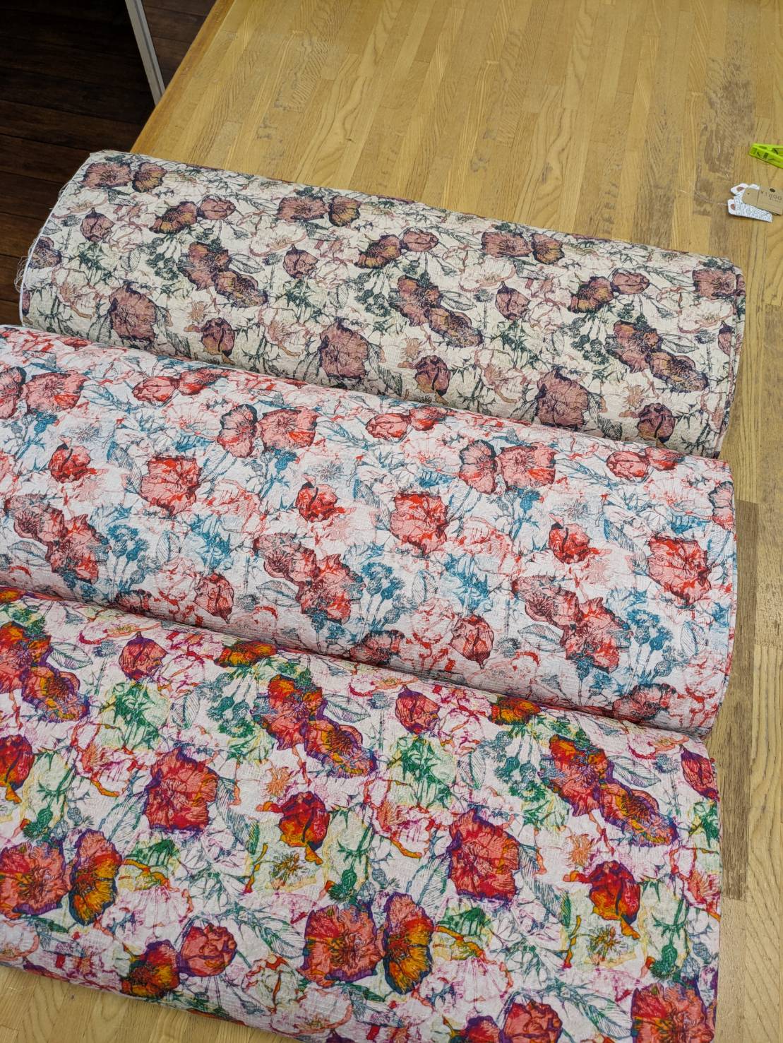 ジャガード織りに繊細なフラワーモチーフをプリントした、表情豊かな綿100%素材です。