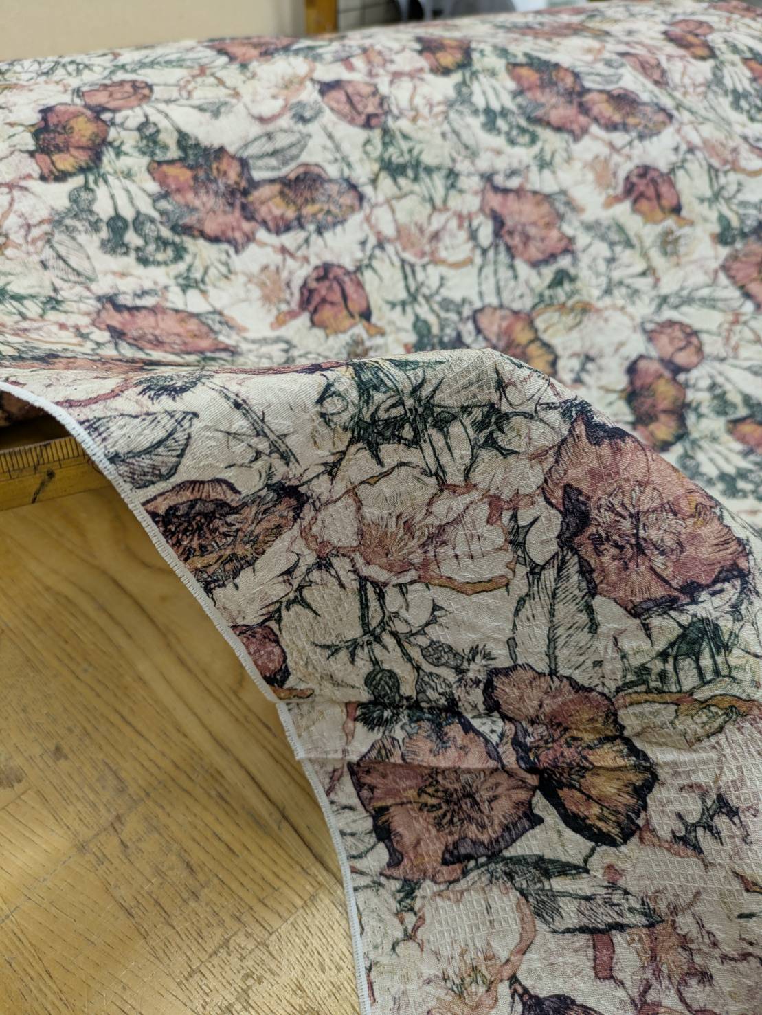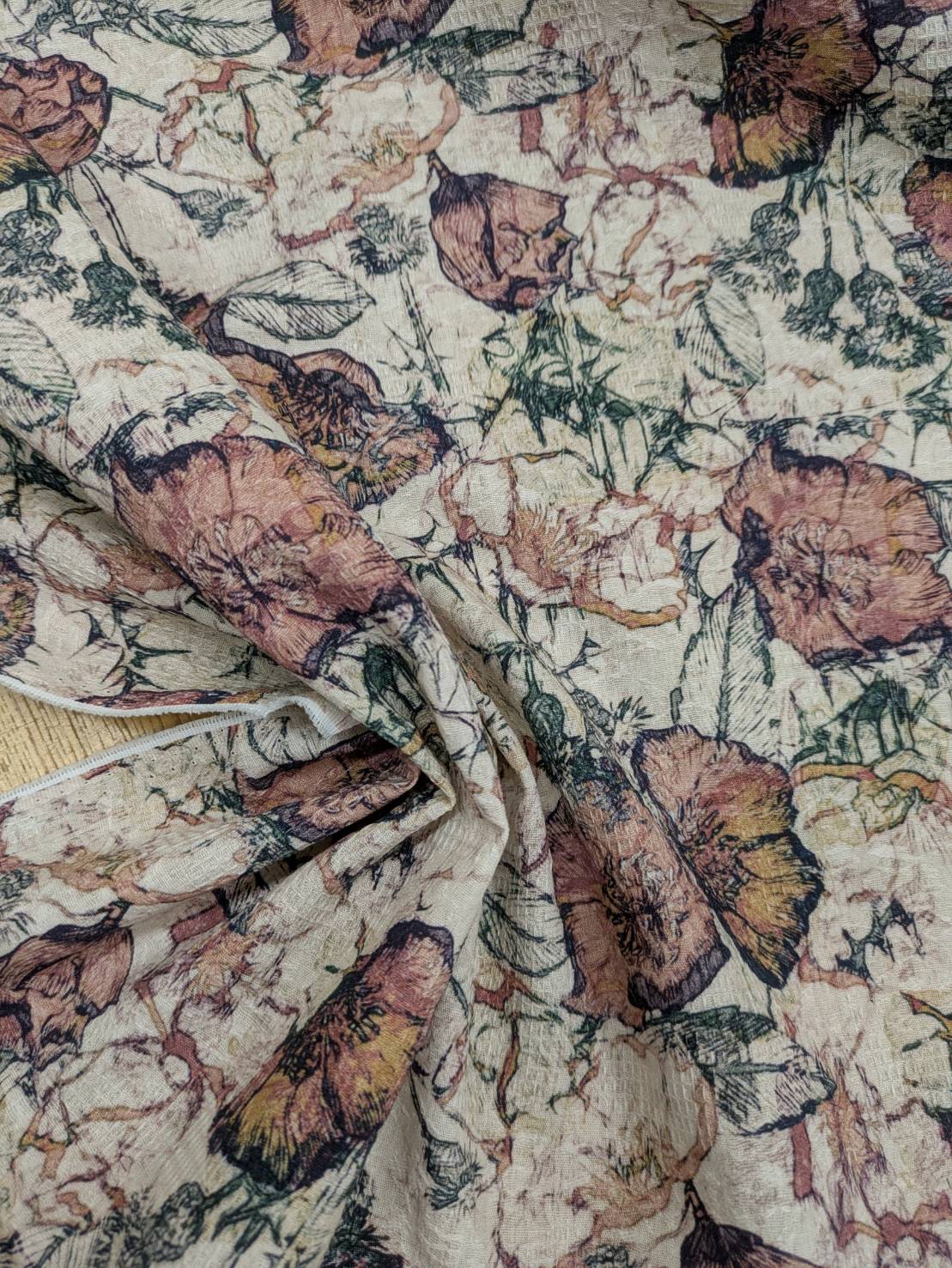 ジャガード織りに繊細なフラワーモチーフをプリントした、表情豊かな綿100%素材です。