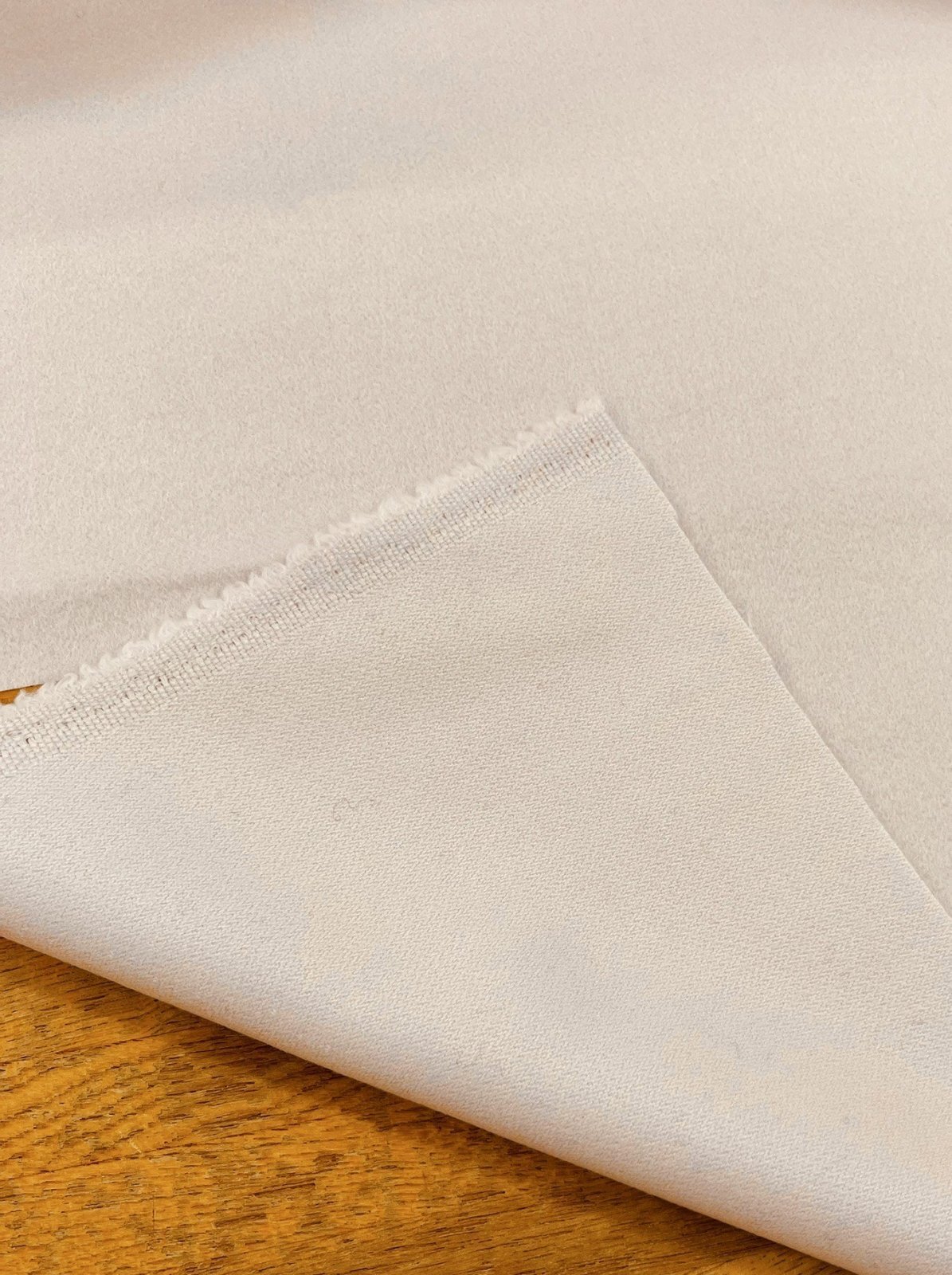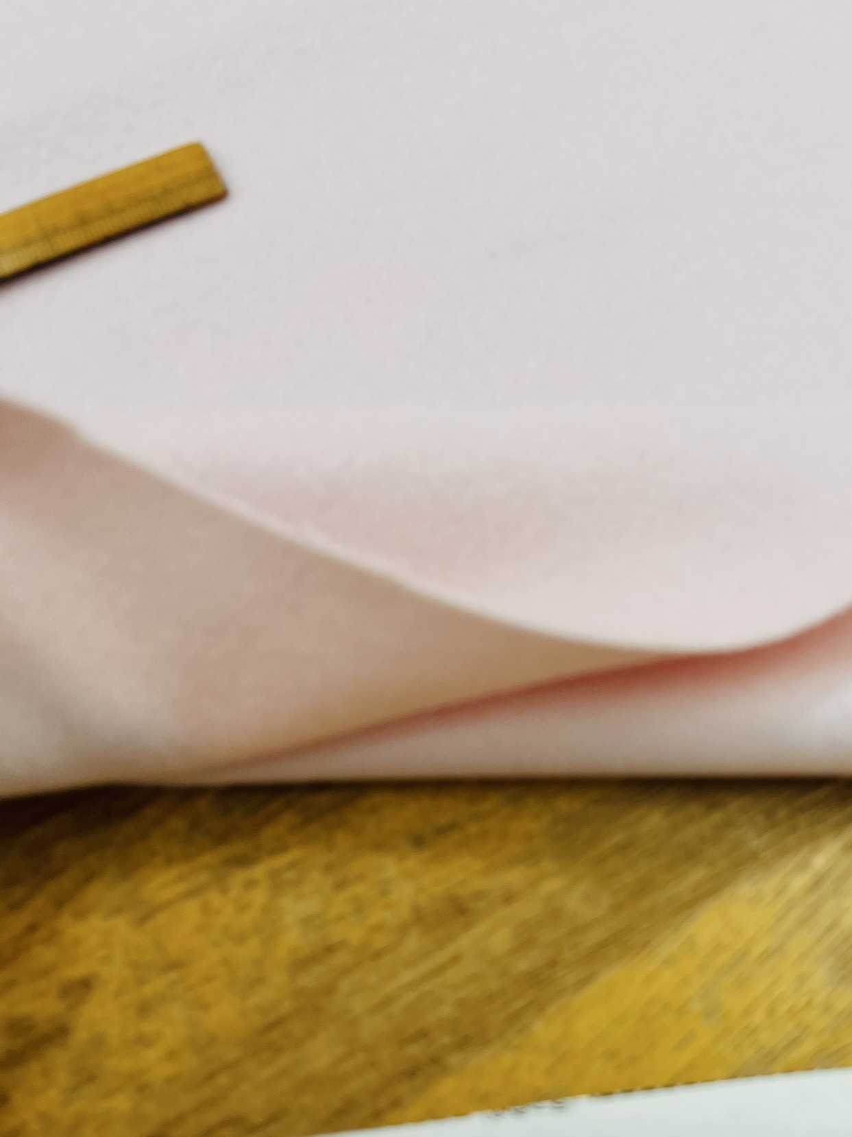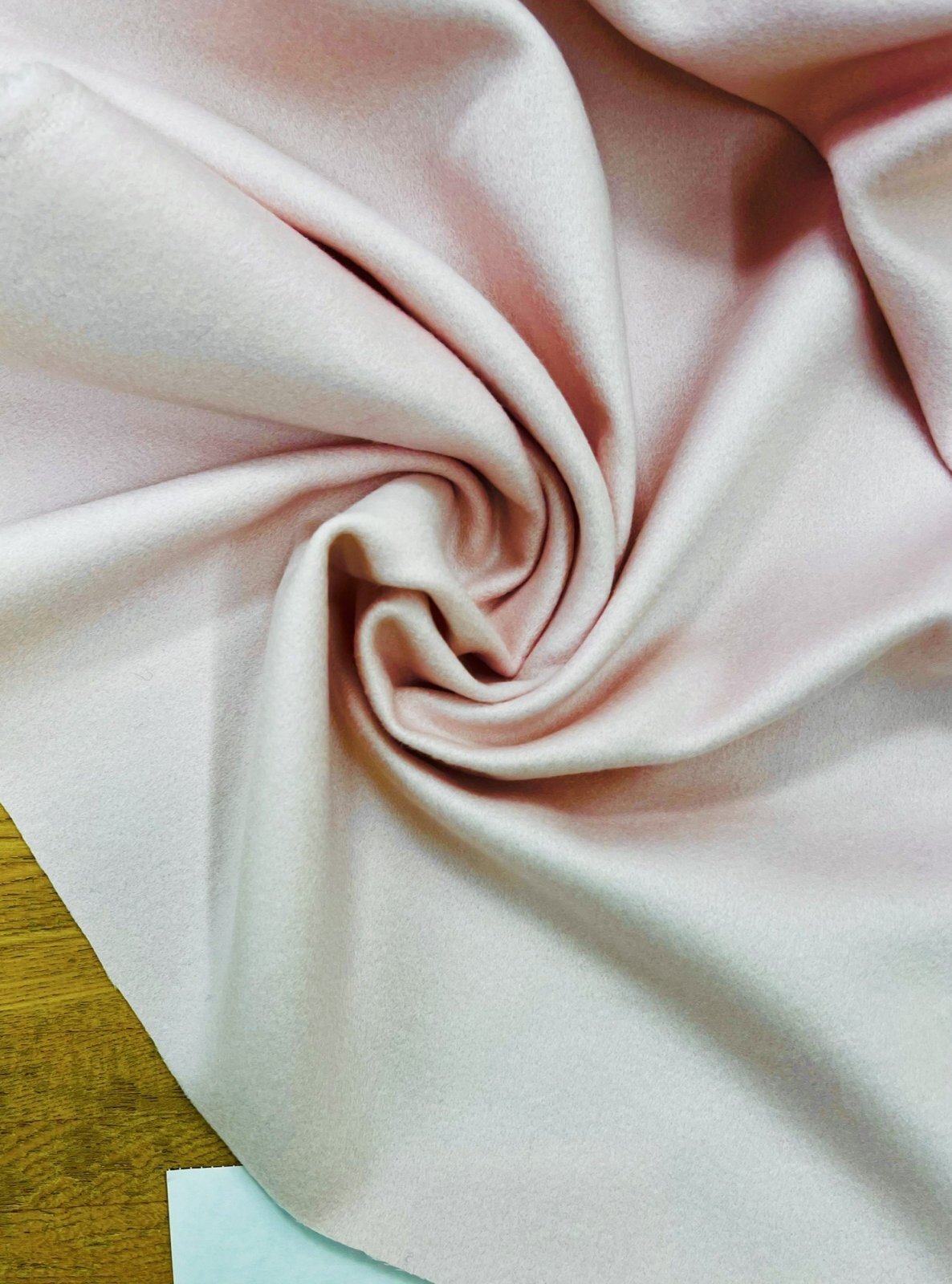 ウール混ならではのやさしい起毛感と、淡く上品なライトピンクが印象的な素材です。