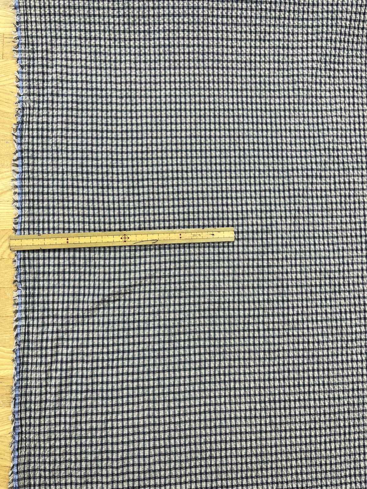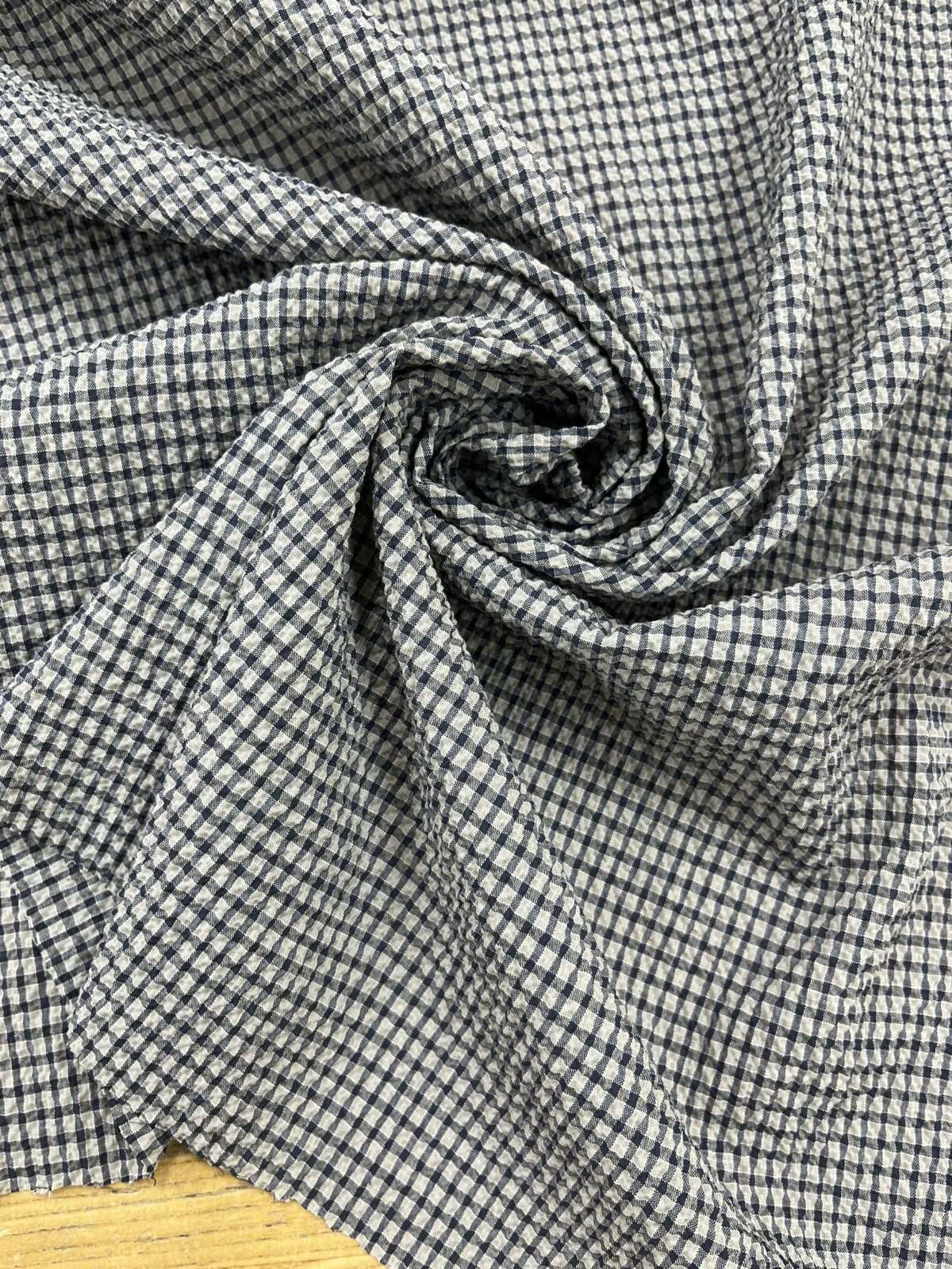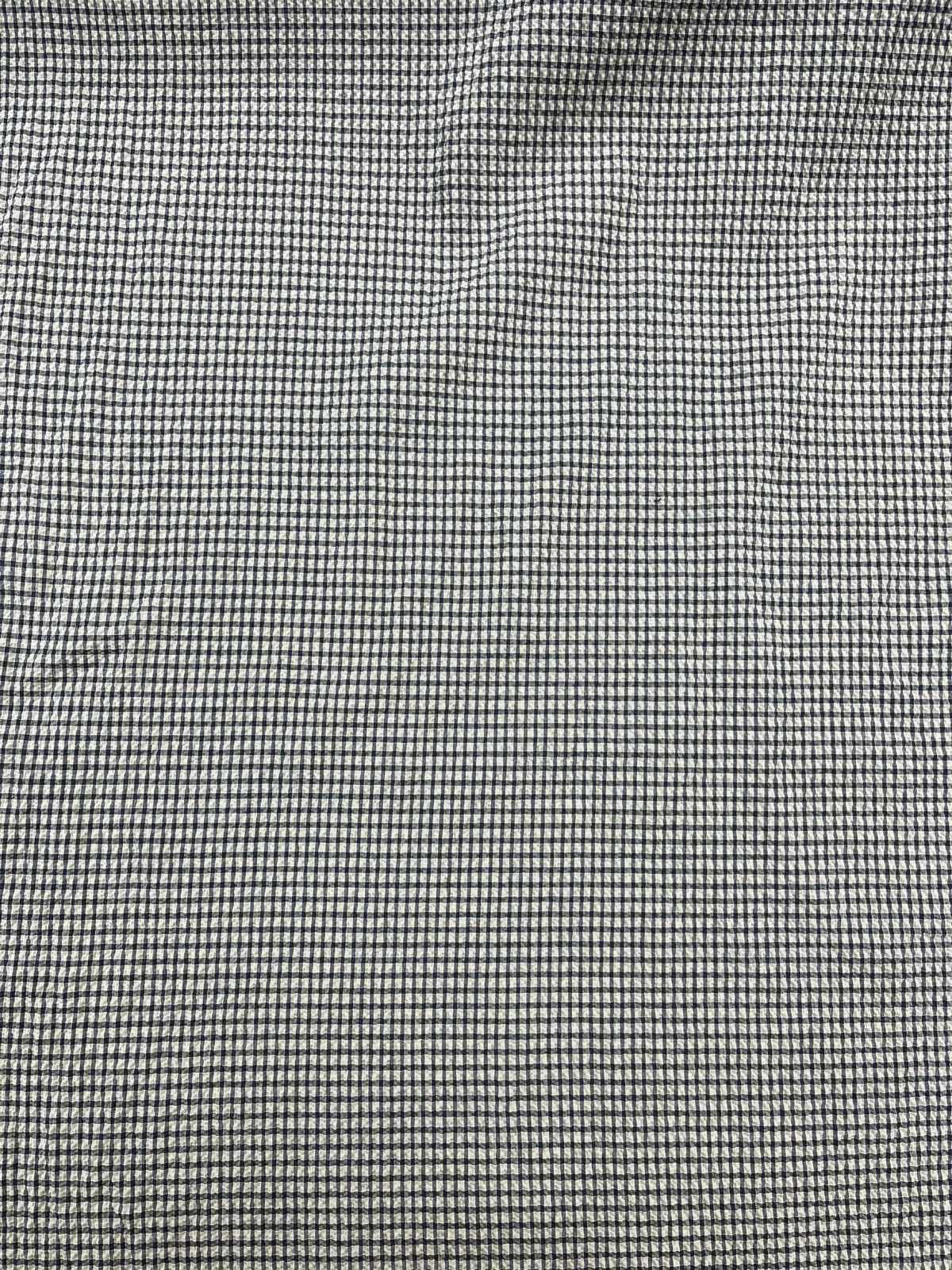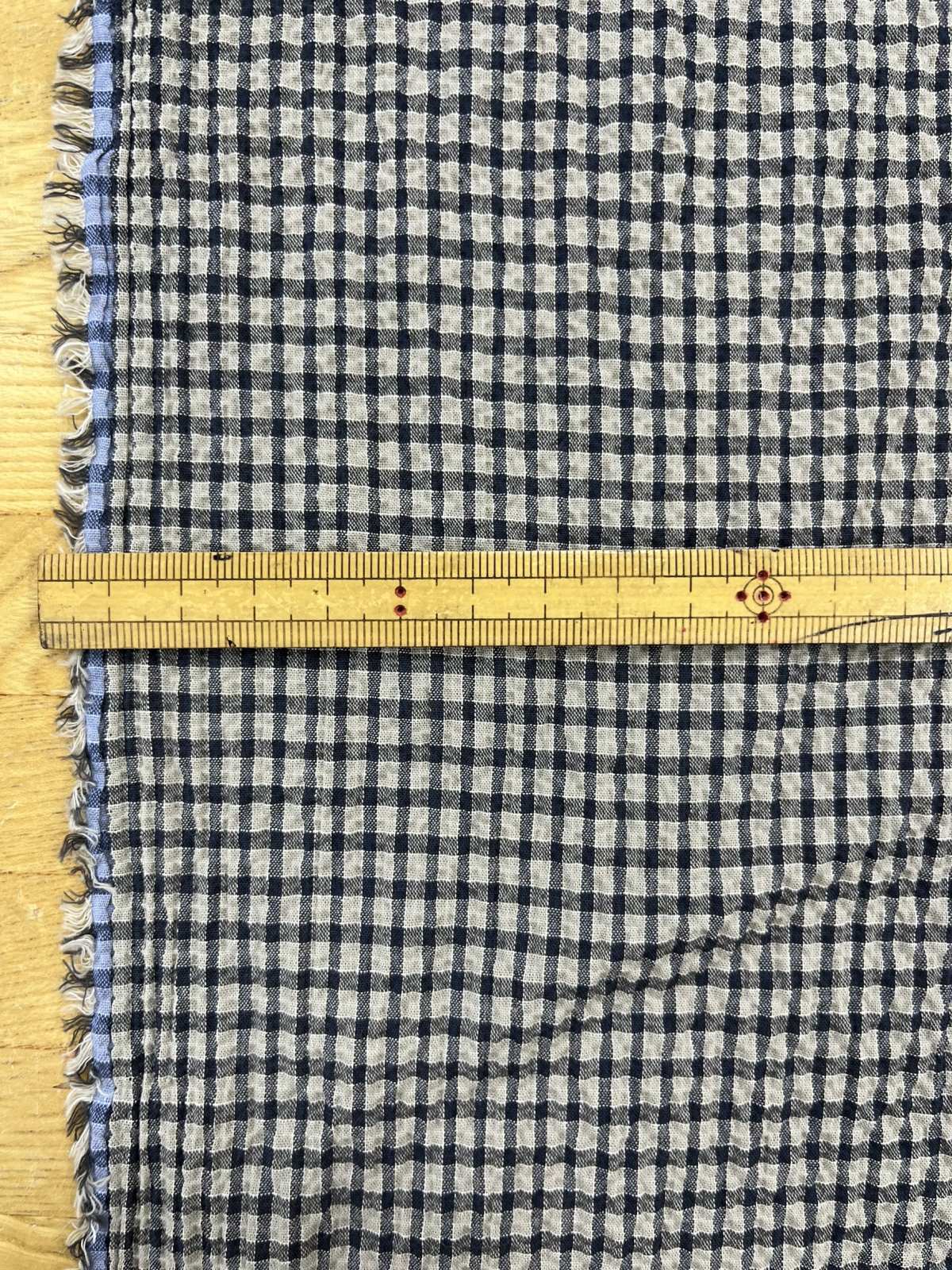 細かなネイビー×生成りの格子柄がやさしく並び、ナチュラルで上品な印象。
