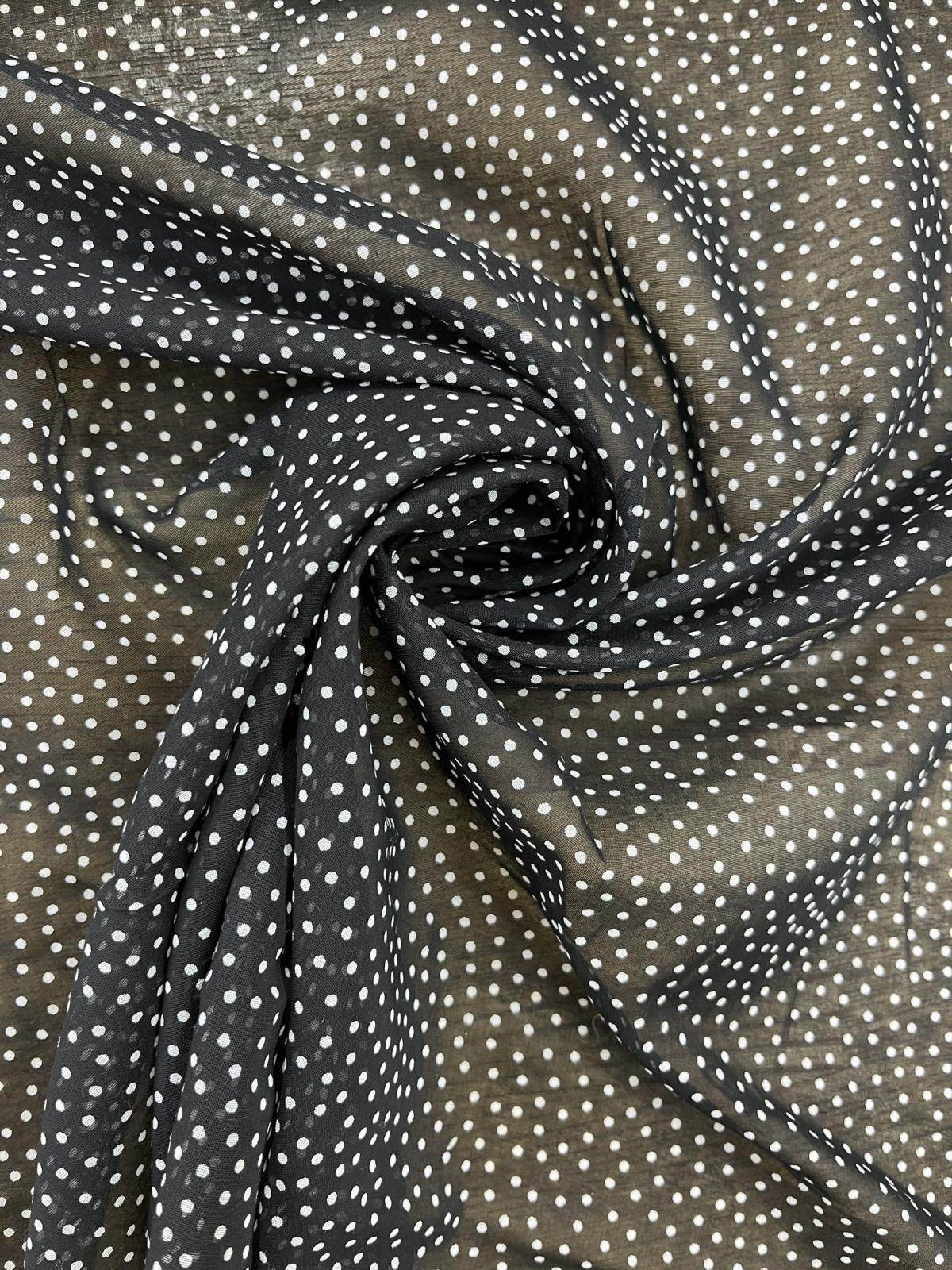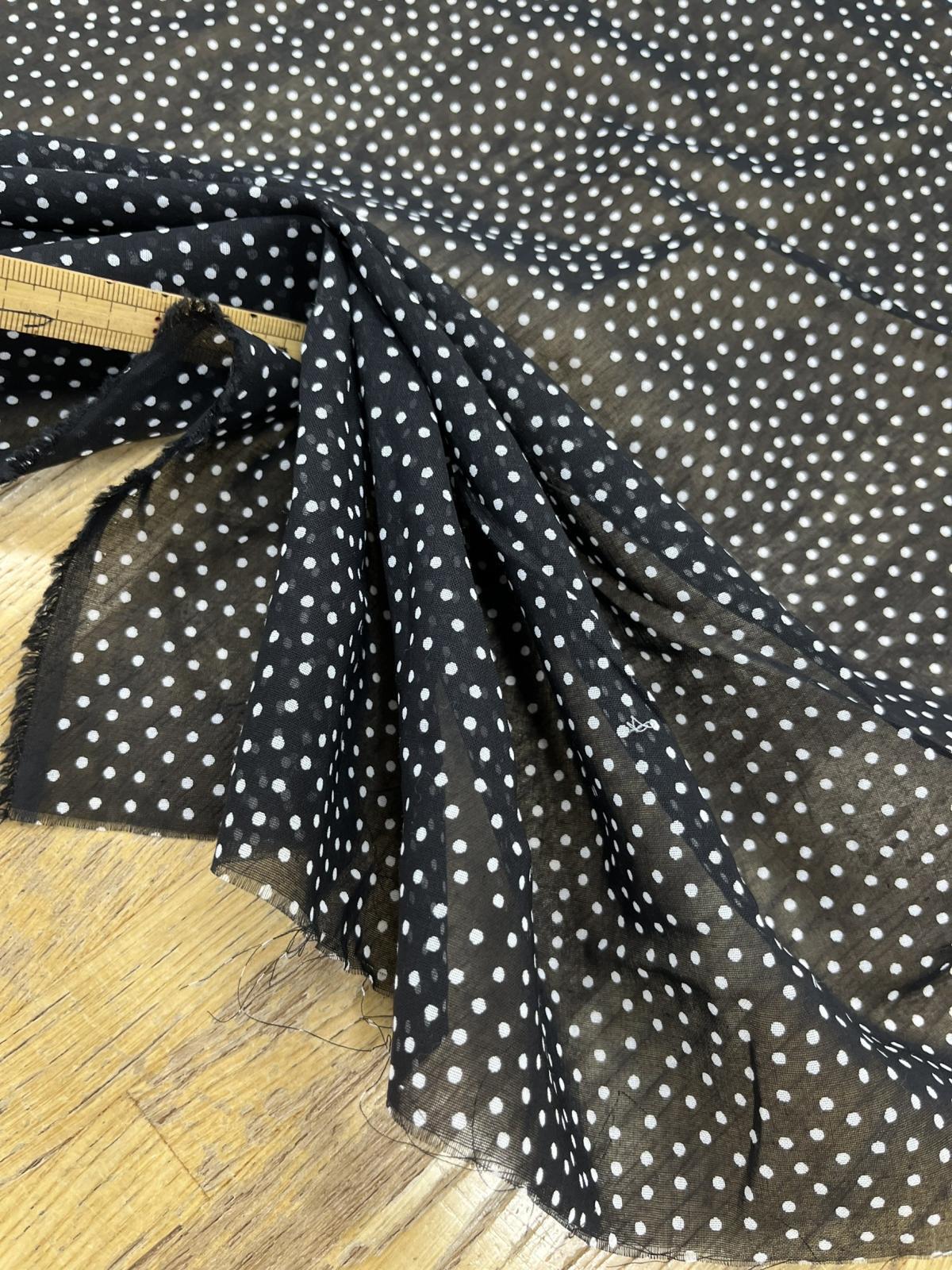 綿100%のランダムドット柄シアー素材。ブラック地にホワイトの小さなドットが散りばめられたデザインで、