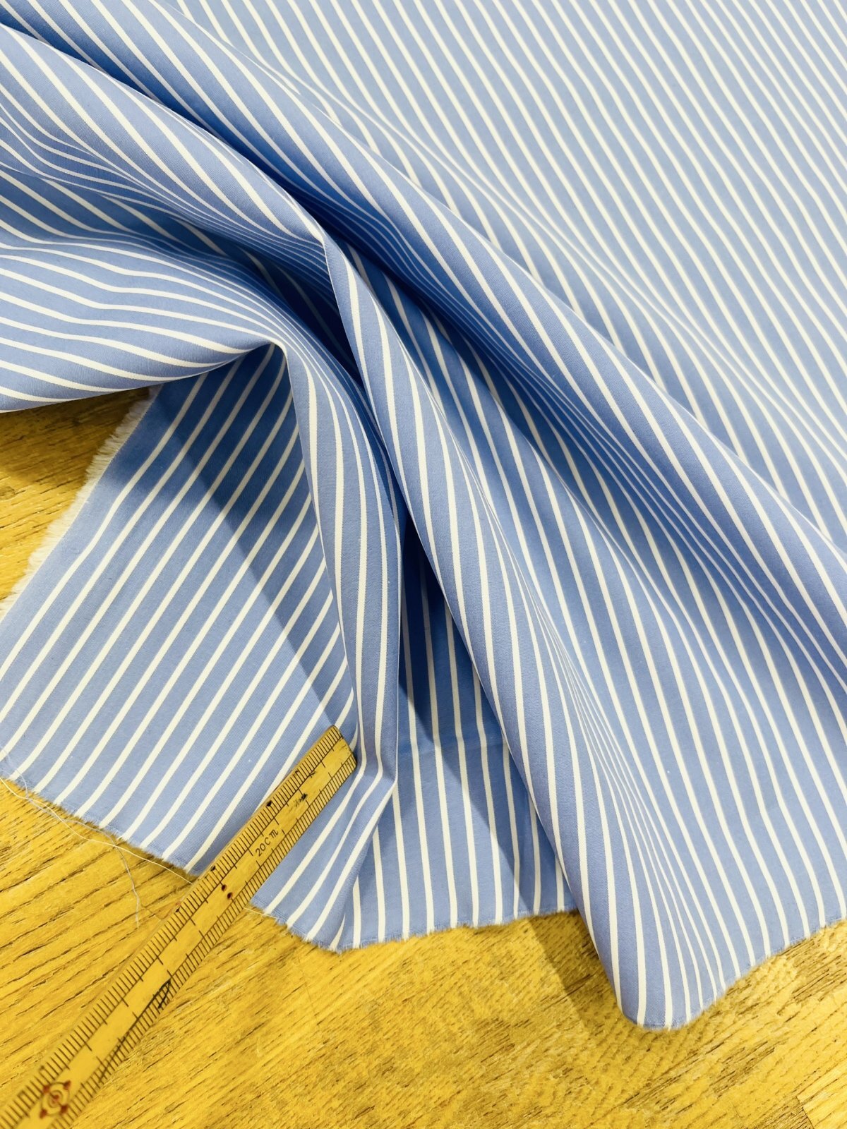 爽やかなブルーに細めのホワイトストライプが入った、清潔感のある先染めコットン素材です。