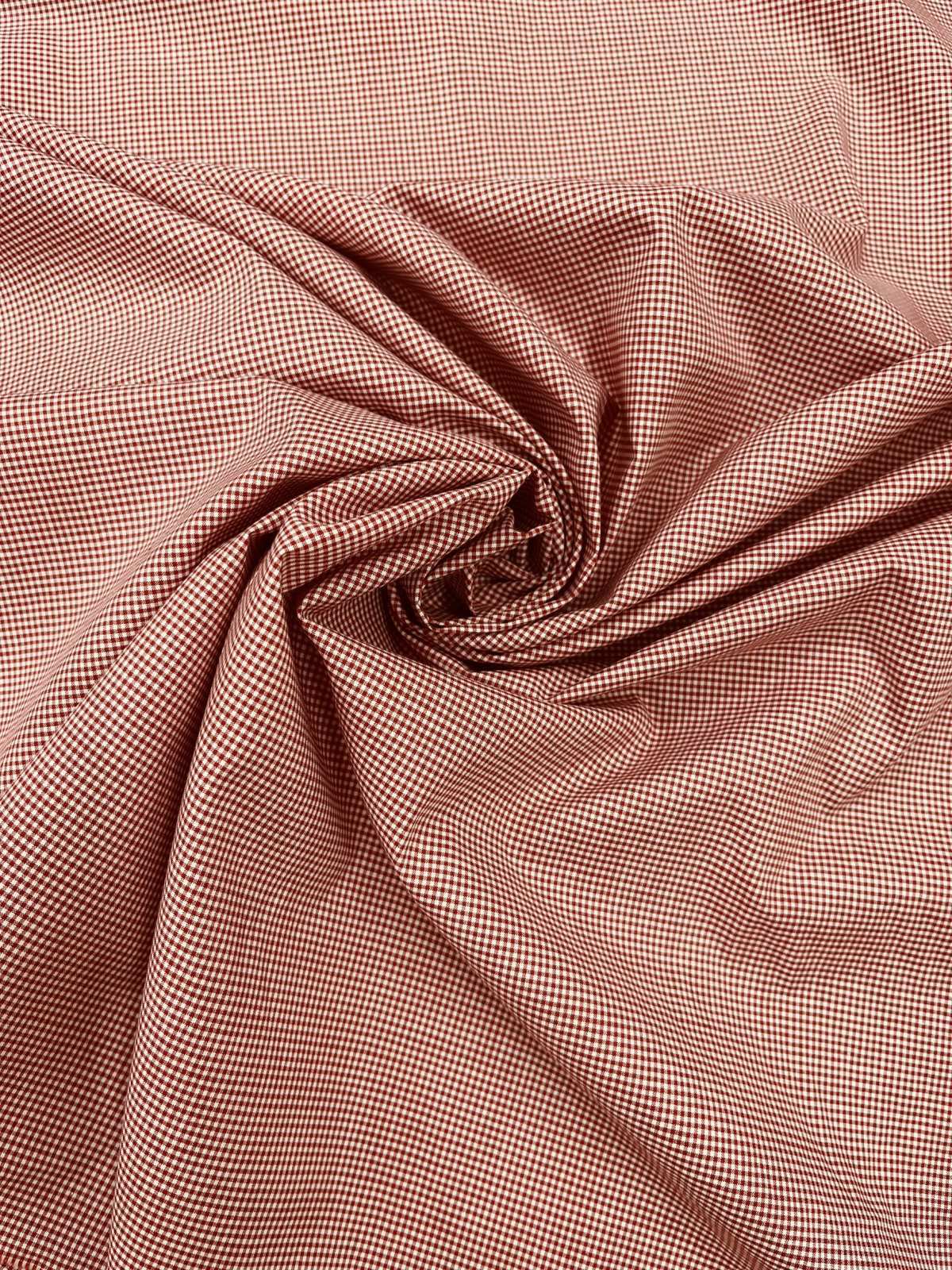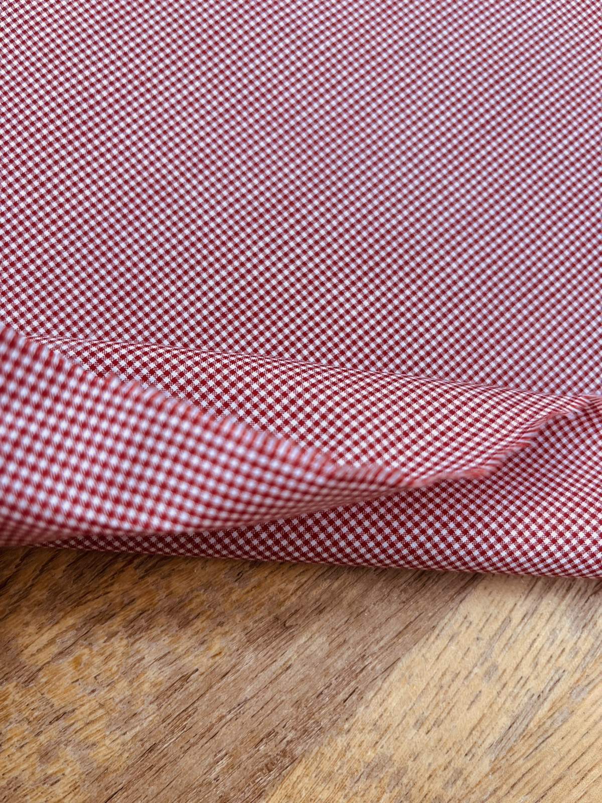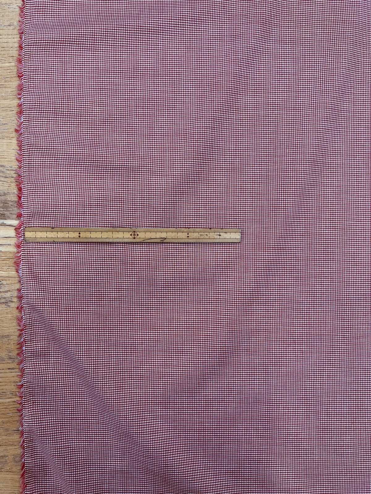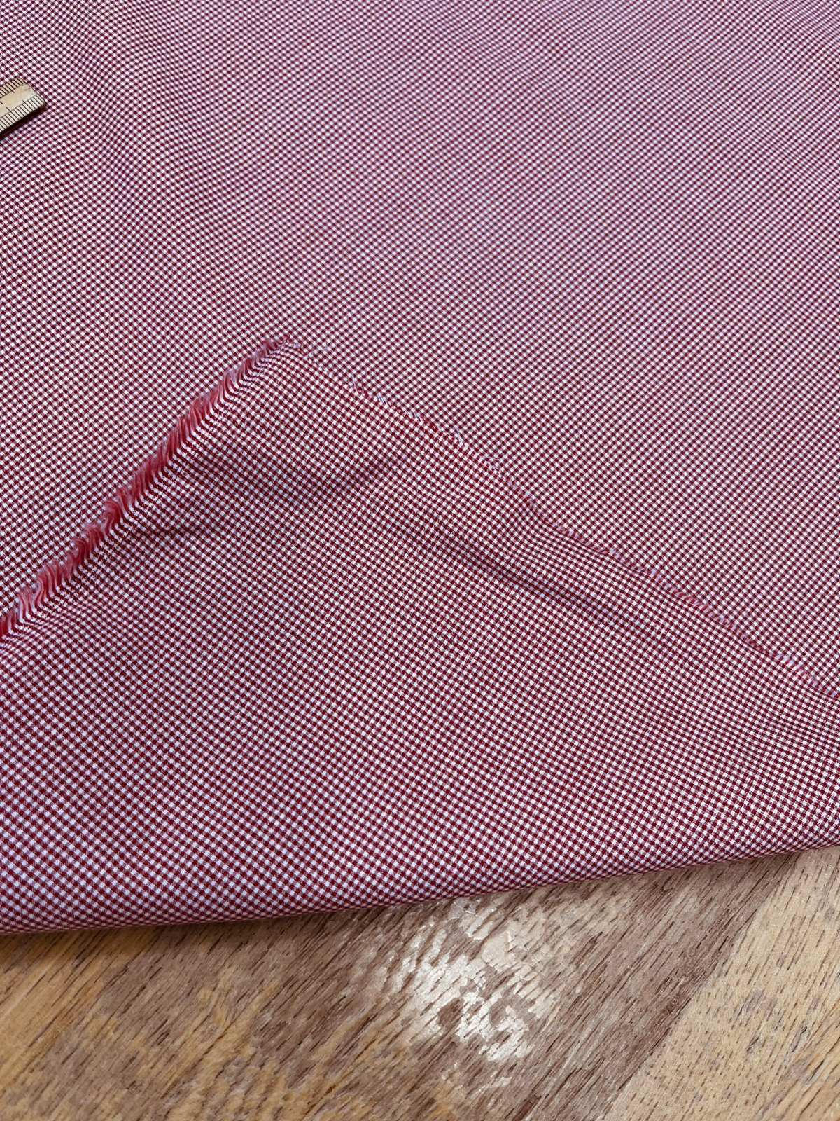 白地に赤の極小ギンガムチェックをあしらった、細やかで上品な印象のコットン素材。