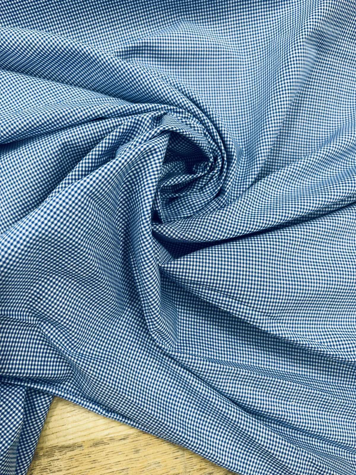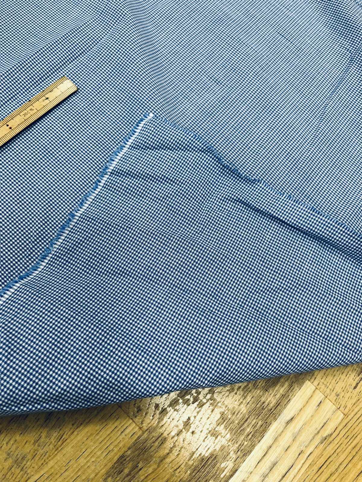 白地に青の極小ギンガムチェックをあしらった、細やかで上品な印象のコットン素材。
