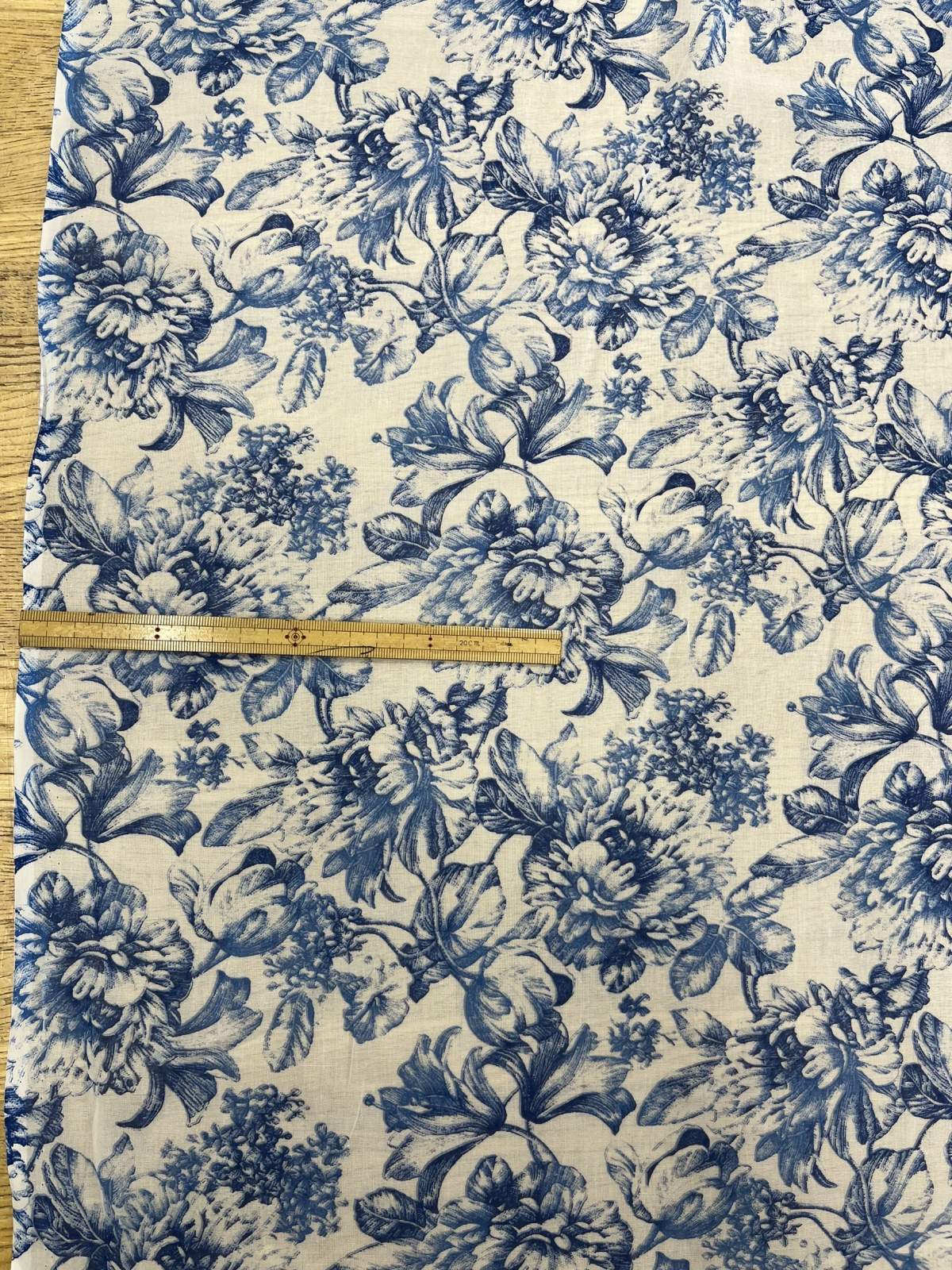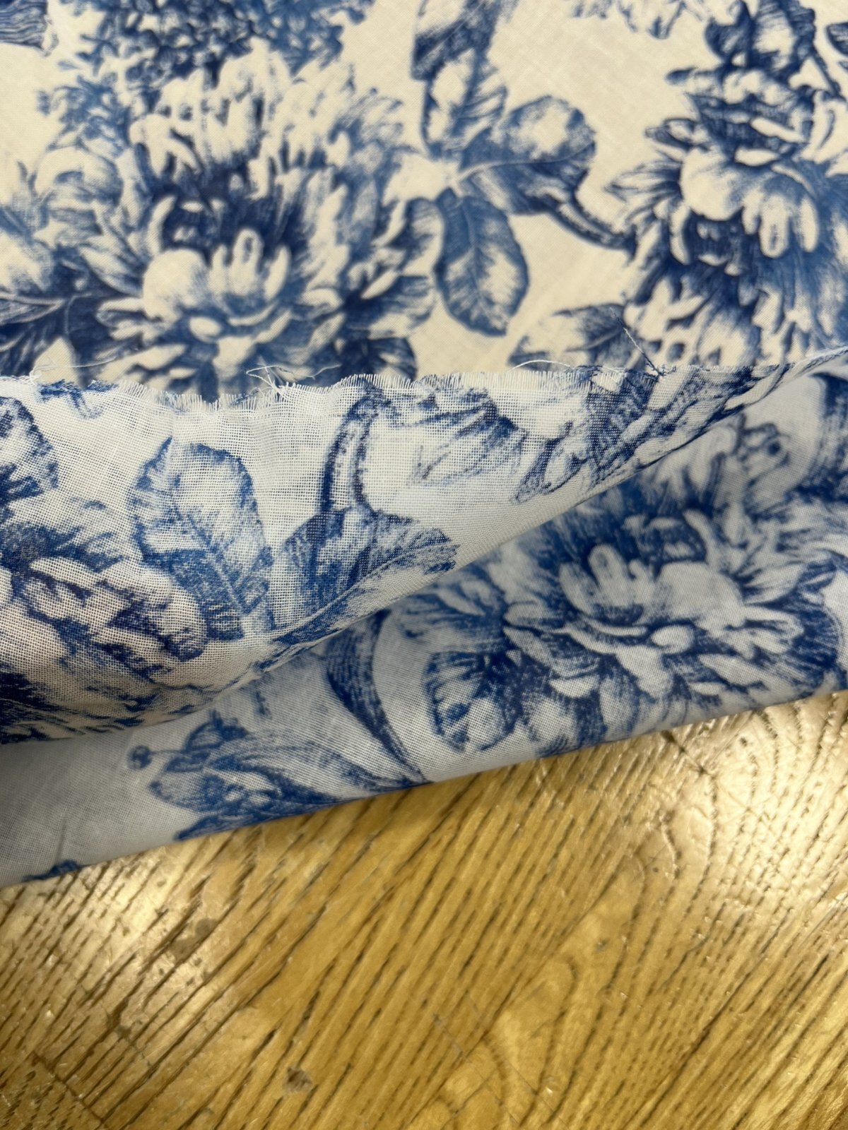 白地に繊細なブルーの花柄を描いた、上品で爽やかな印象のコットンローン。