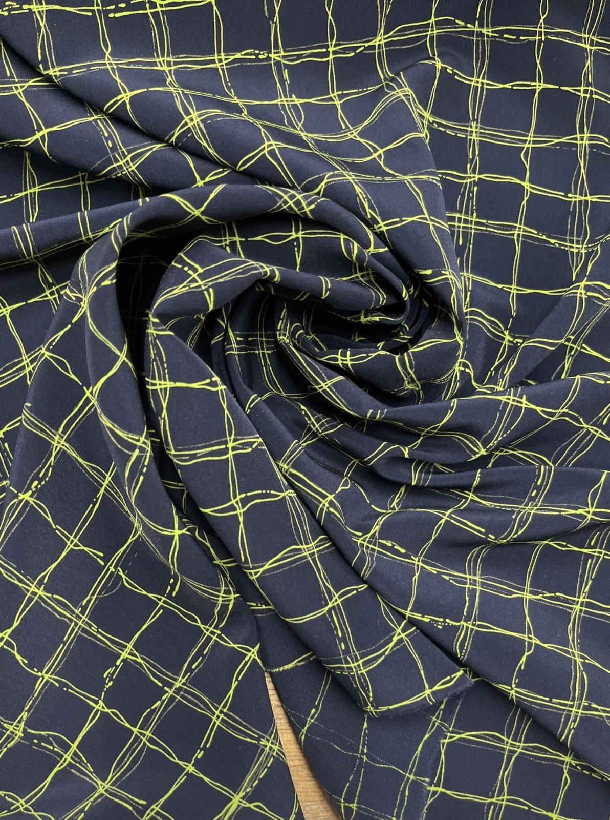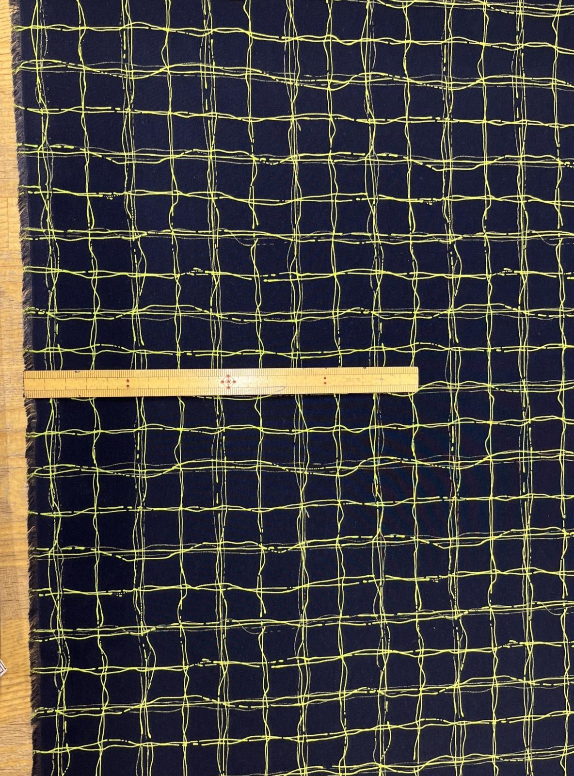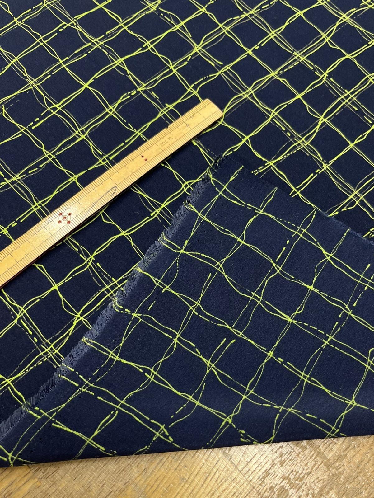 生地:ポリエステル100%手描き風格子プリント デシン(ネイビー×蛍光グリーン) [kiji-3286]