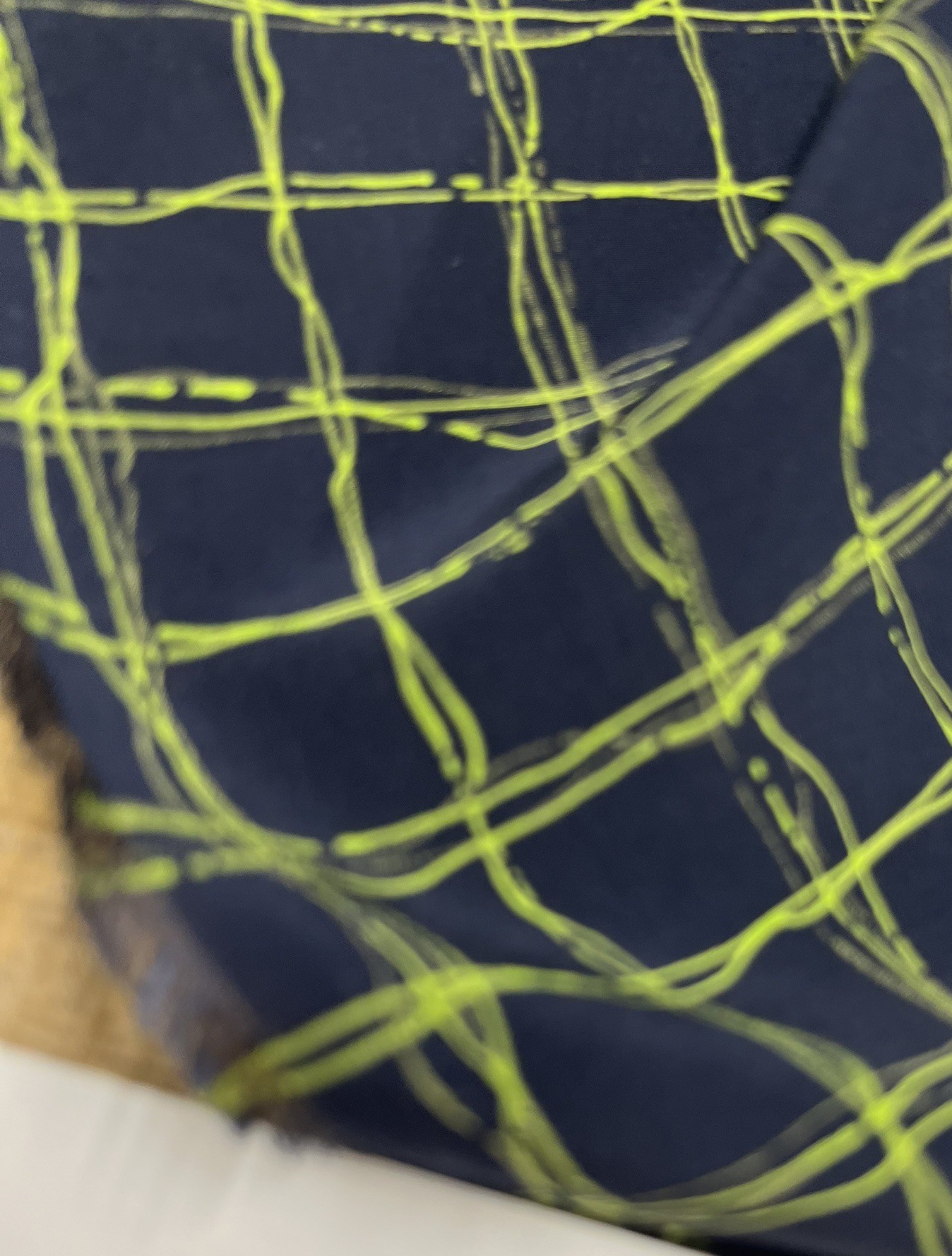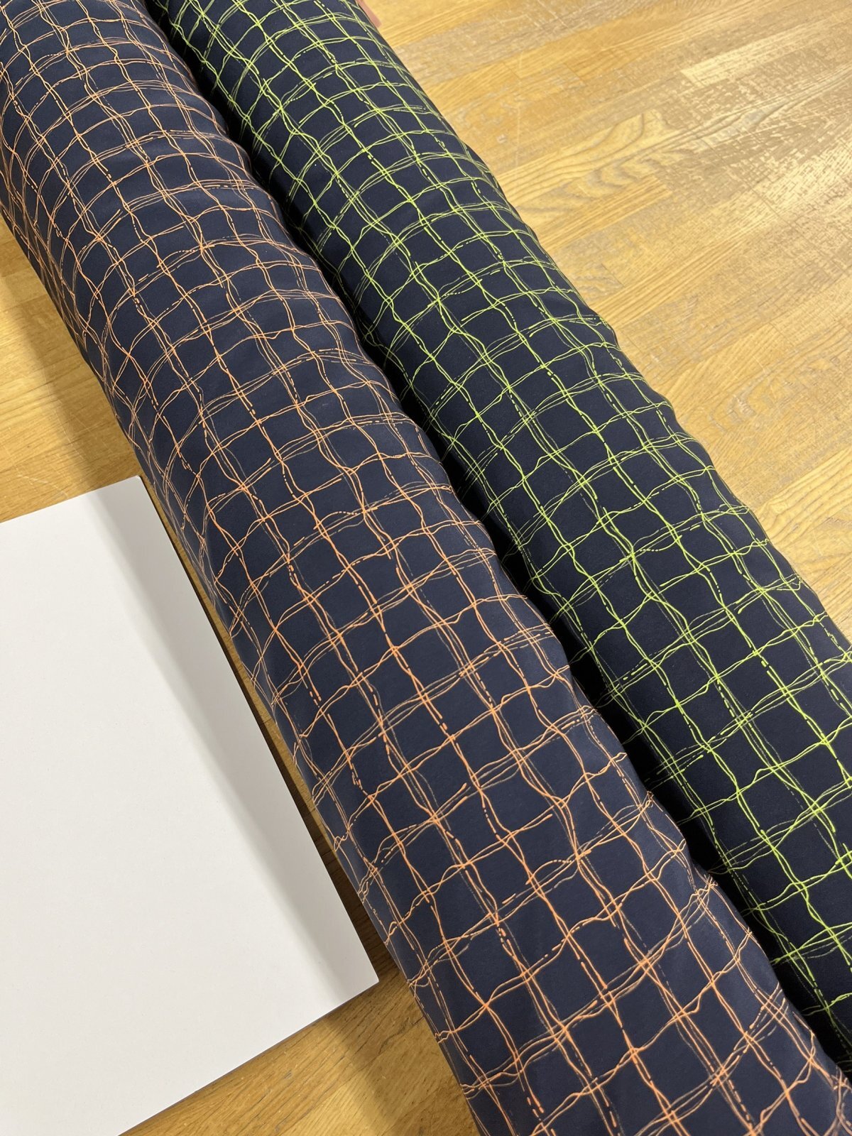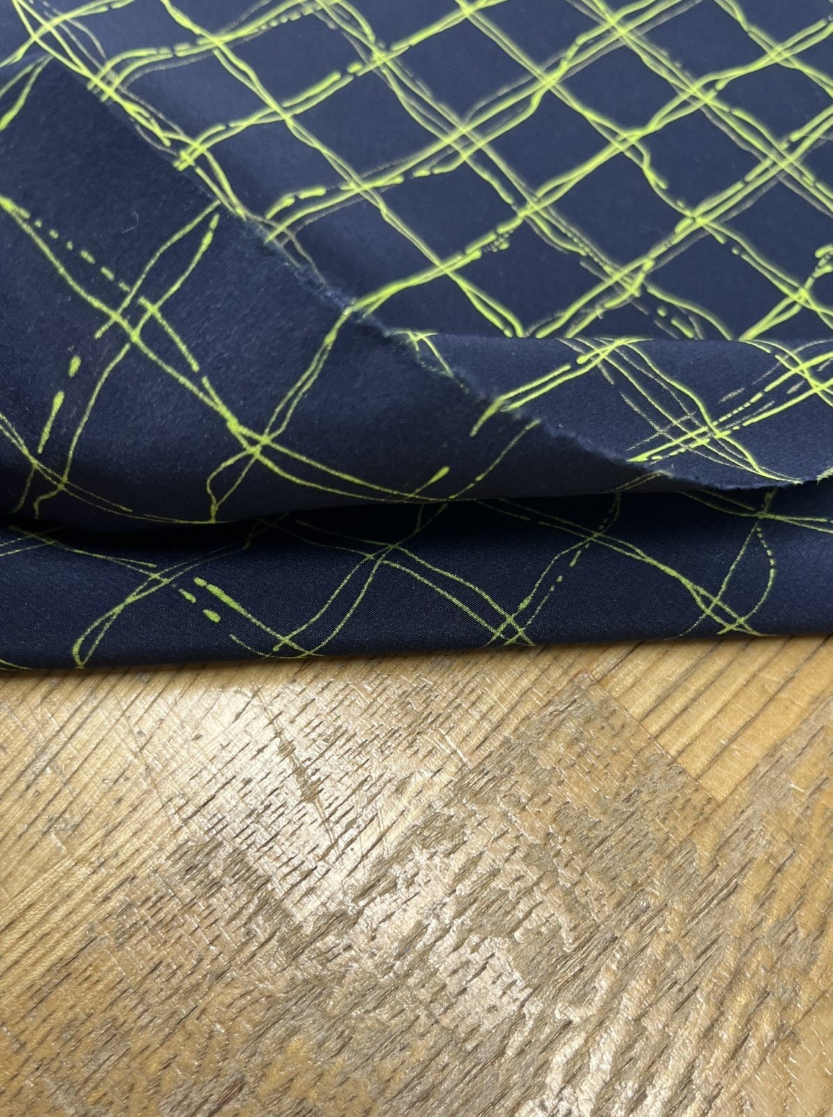生地:ポリエステル100%手描き風格子プリント デシン(ネイビー×蛍光グリーン)
