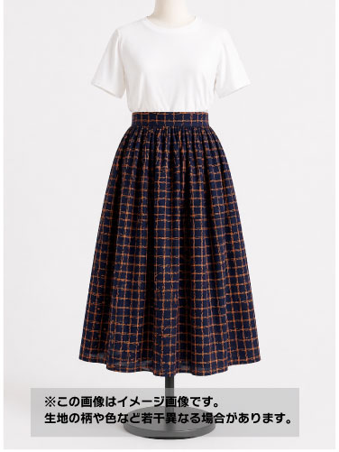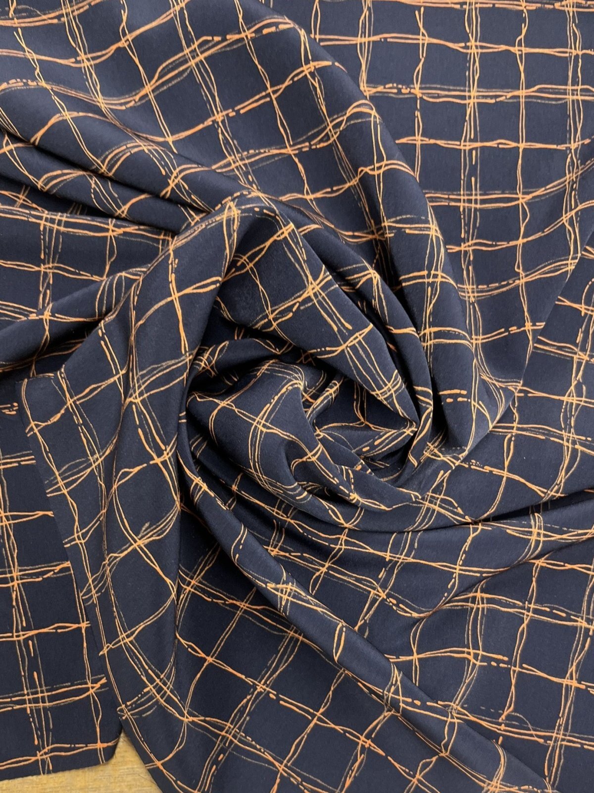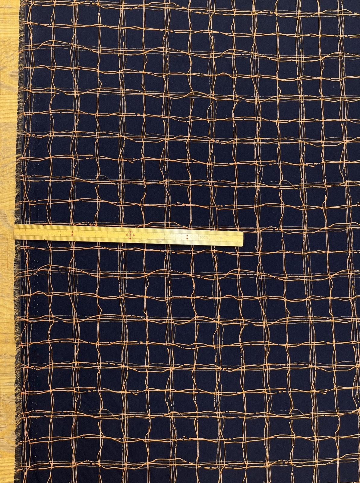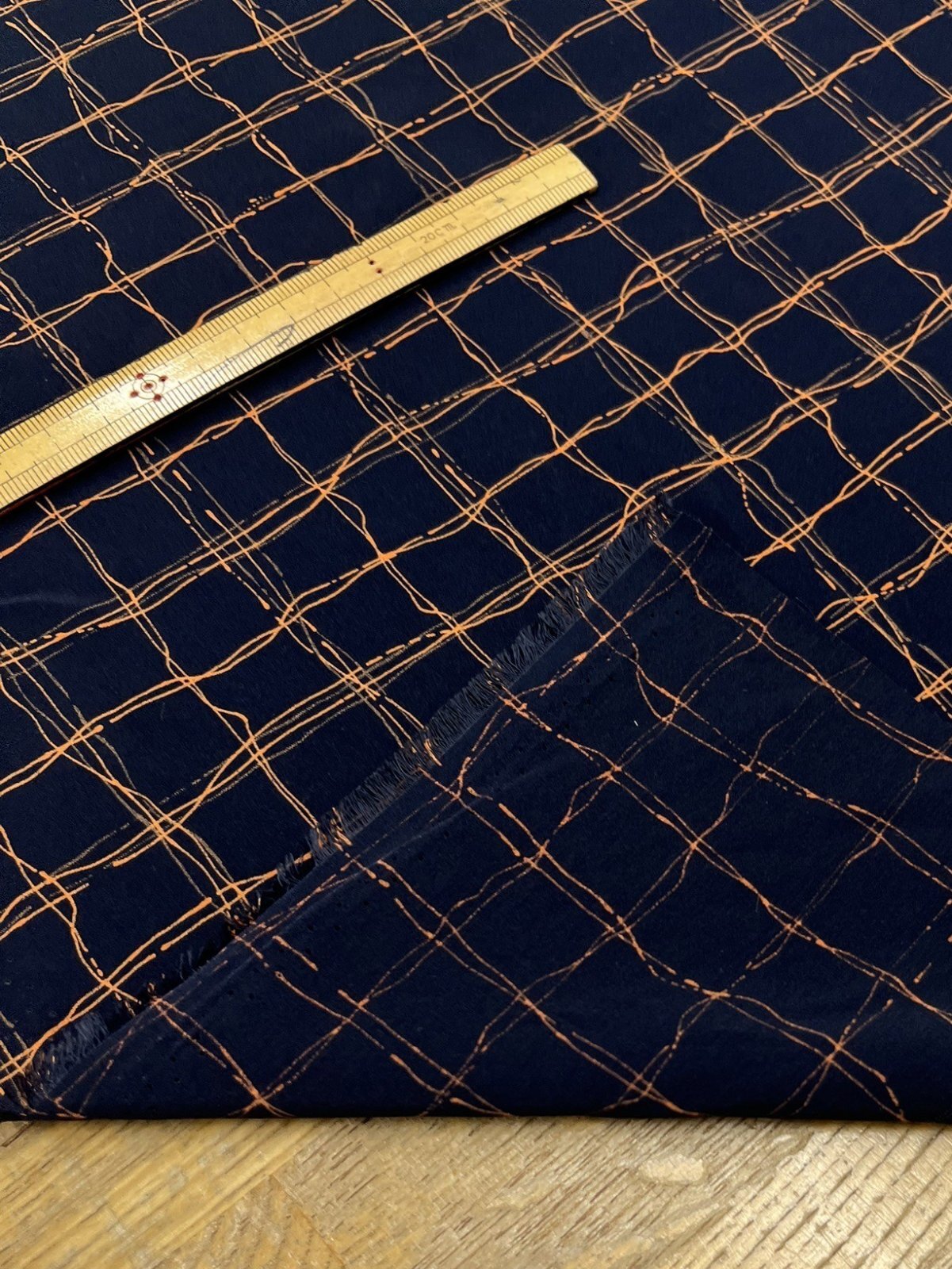 生地:ポリエステル100%手描き風格子プリント デシン(ネイビー×オレンジ) [kiji-3287]