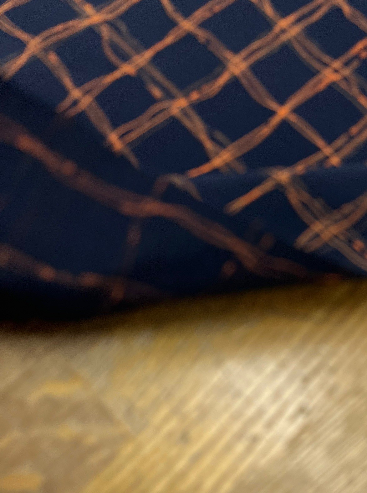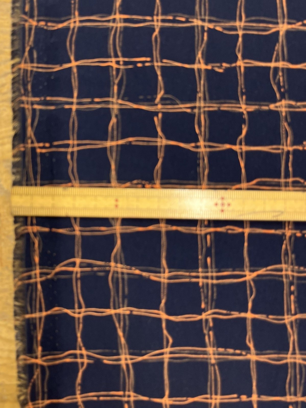 生地:ポリエステル100%手描き風格子プリント デシン(ネイビー×オレンジ)